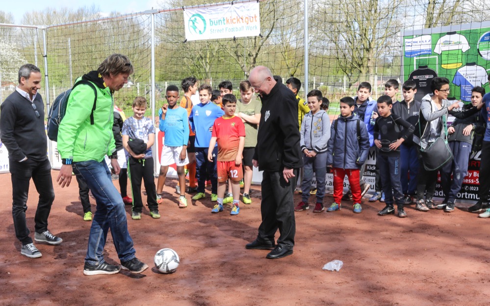 Aus Anlass des Eröffnungstages fand auch die offizielle Übergabe der Streetkickanlage durch Frank Klein von Communitas an Erwin Fischer, Projektleiter von BuntKicktGut, statt. Auch Dr. Ludwig Jörder, Bezirksbürgermeister Innenstadt- Nord, Mirza Demirovic (Jugendamt), Veit Hohfeld (Stadtteil-Schule) und Jörg Loose (AWO) nahmen an der Eröffnung teil.