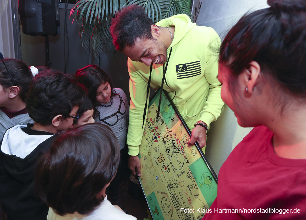 Die ließen ihn nicht zur Ruhe kommen, zupften an seiner Kleidung – hier ein Autogramm, da noch ein Foto. Offensichtlich hatte der Fußballer Spaß an der quirligen Rasselbande, die ihn umschwärmte wie die Motten das Licht. Ein selbstgemaltes Bild haben sie für ihn als Geschenk vorbereitet. Darauf zu sehen: Motive aus der Welt des Fußballs und eine Anzeigentafel mit dem Spielstand BvB – Bayern: 10 000 – O. Ein wenig unrealistisch, zugegebenermaßen, aber Aubameyang strahlte angesichts des Ergebnisses und der Popularität, die er hier genoss, übers ganze Gesicht und nahm sich Zeit für die jungen Nordstädter.