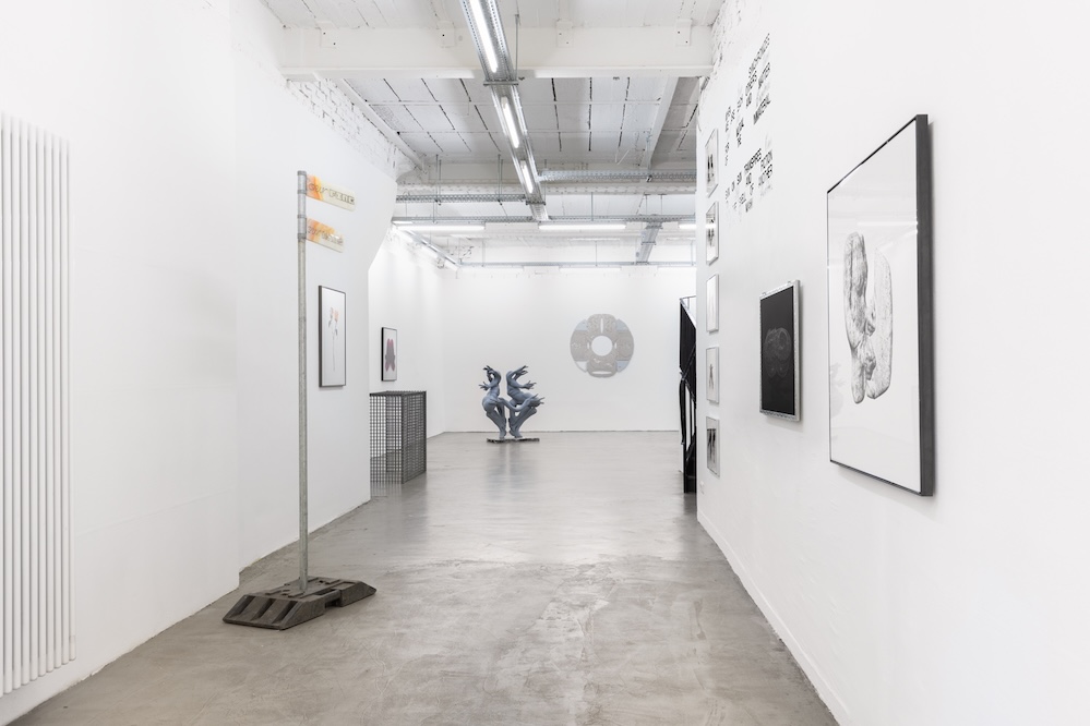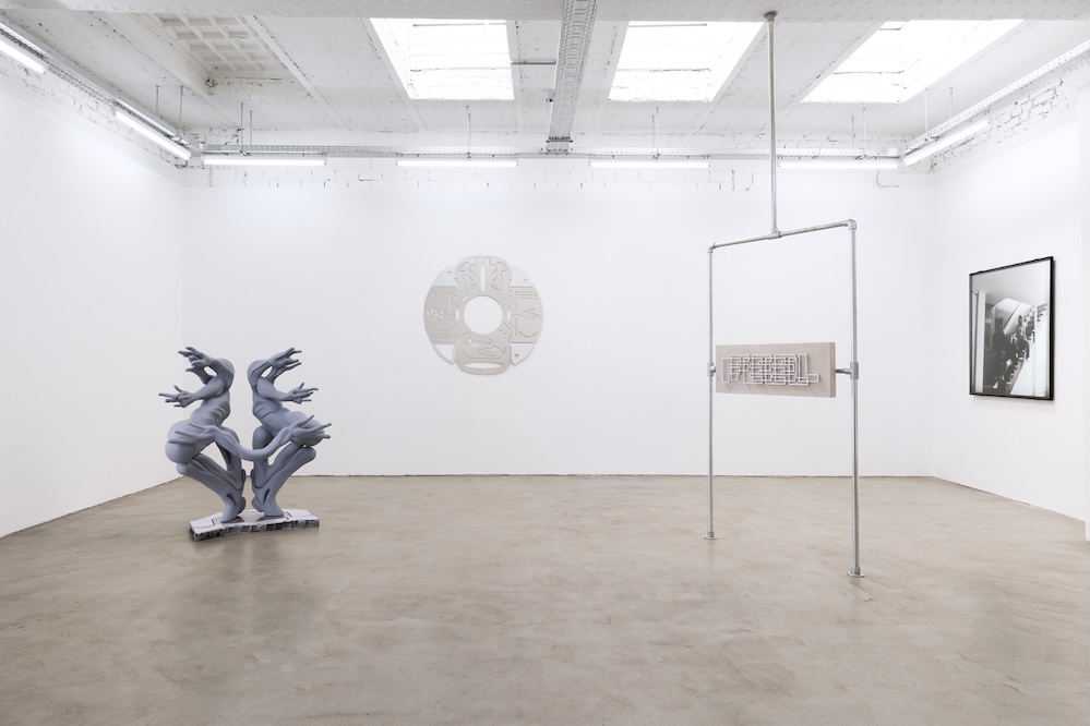 Aktuellste Arbeit der Ausstellung ist „Hydra“, eine Skulptur, die auf dem Dialog der beiden Künstler:innen mit einer KI basiert. „Wir haben versucht mit der KI das Bild eines ungeschlechtlichen Wesens zu erzeugen. Das Ergebnis haben wir dann in ein Objekt übersetzt“, erklärt Mattias Schneck. Schnell wurden Mängel deutlich – Schneck: „Das Netz ist voller Stereotypen, was wir rein geben, bestimmt die Form.“