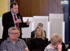 Im Plauderton, aber in der Sache entschlossen, berichtete Reul seinen ZuhörerInnen „aus dem Nähkästchen“. Zum Beispiel seine Enttäuschungen darüber, wie langwierig viele Vorhaben sind und wie schwer umzusetzen. So habe er anfangs gedacht, die 350 NRW-PolizeibeamtInnen, die vor allem in der Gebäudebewachung eingesetzt sind, durch private Wachdienste zu ersetzen.