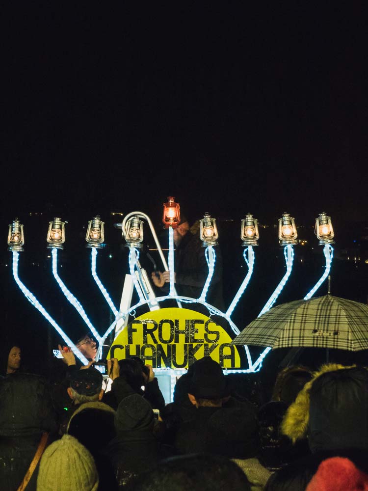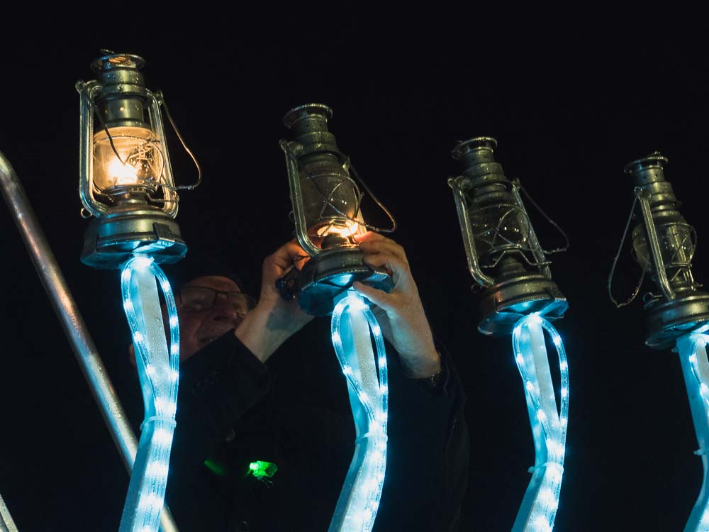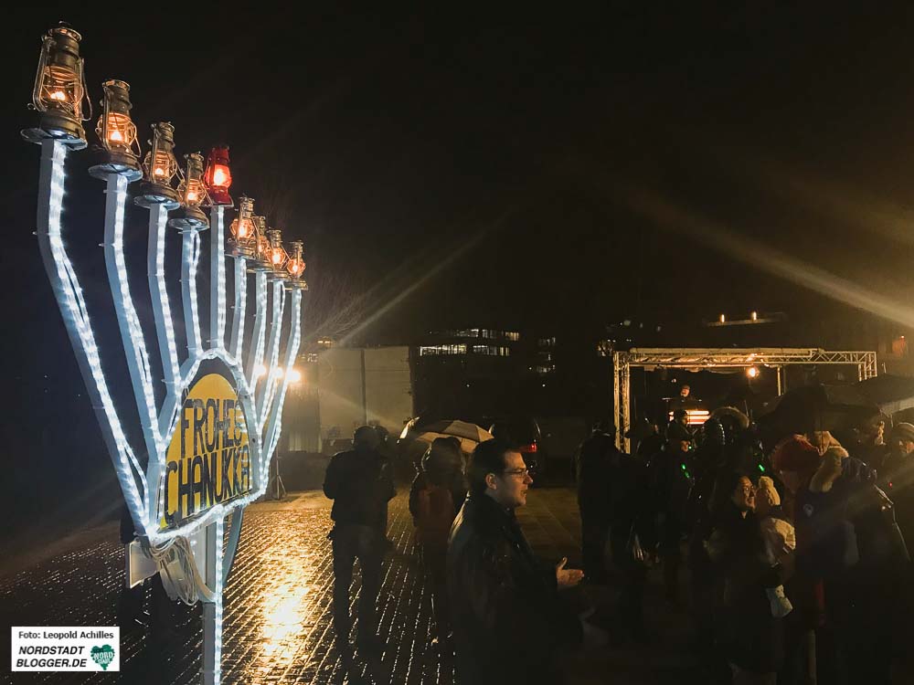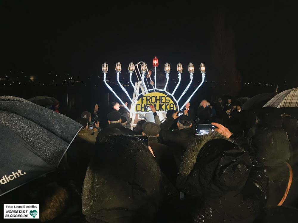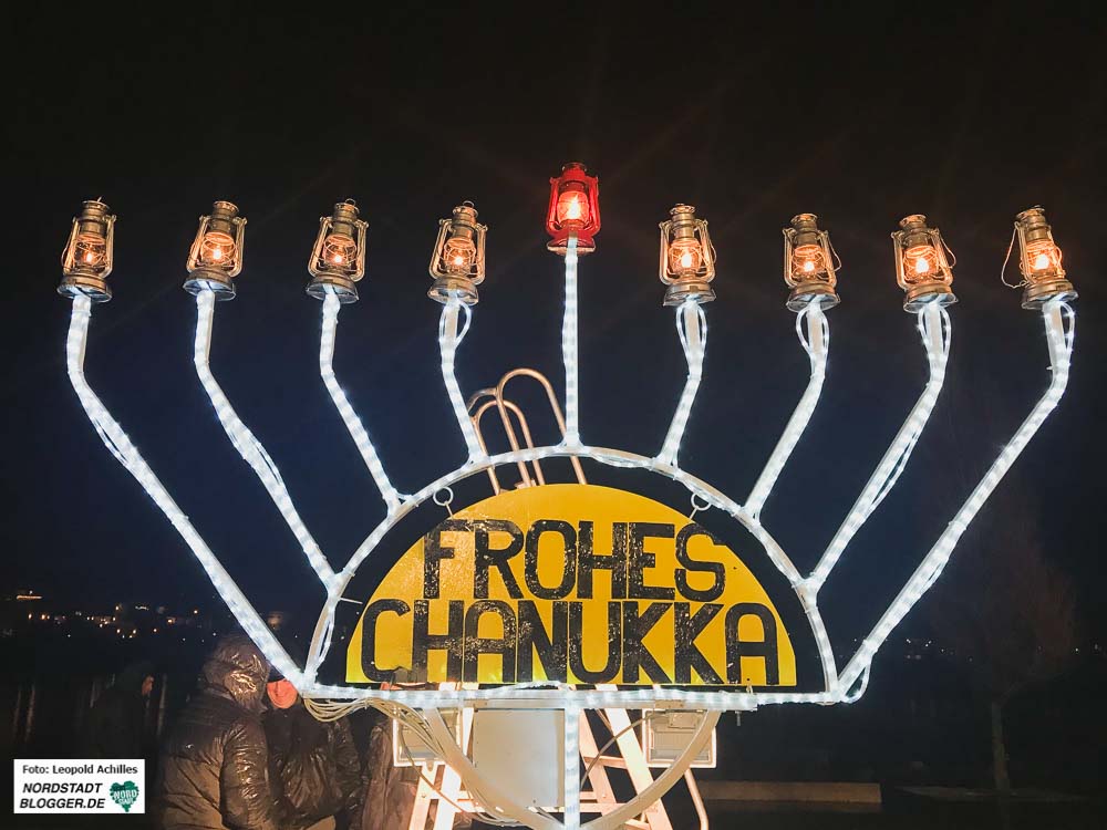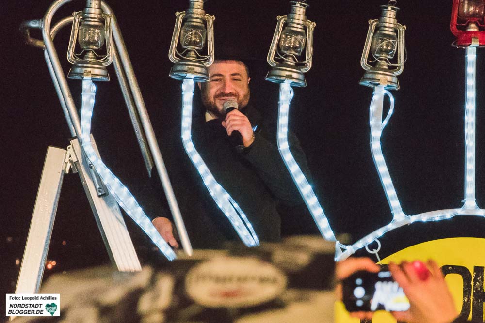Als Höhepunkt der Feier wurden auch an diesem Abend wieder der neunarmige Leuchter und und seine Lichter entzündet. Anders als beim Symbol des Staates Israel  – dem siebenarmigen Leuchter (Menorah) – kommt beim Chanukka-Fest ein achtarmiger Leuchter zum Einsatz. Dieser hat zudem einen neunten Arm für das Helferlicht.