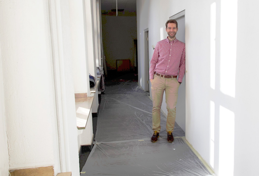 Unter unseren Schuhen raschelt noch die Abdeckfolie. Die Maler sind gerade fertig mit ihrer Arbeit, Möbel und Equipment sind bestellt. Wir stehen im ersten der beiden Büroräume. „Hier kommen acht Arbeitsstationen rein, im nächsten Raum dann noch mal vier“, sagt Tim Schabsky. Alle Büroräume werden ausgestattet mit Schreibtischen, Stühlen, Schränken und Internet. Dazu kommt noch eine Druck- und Kopierstation.