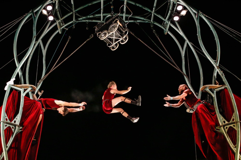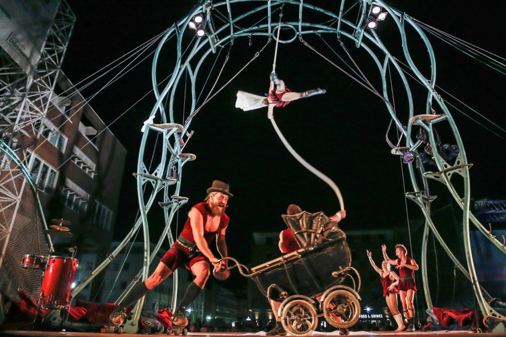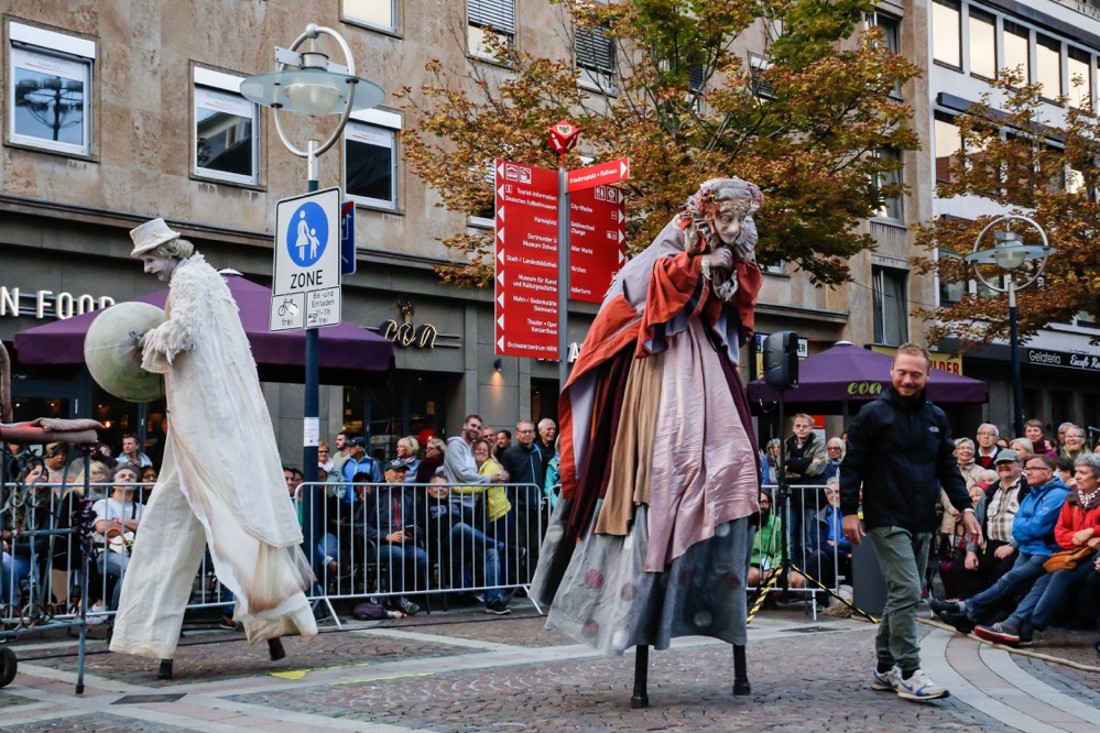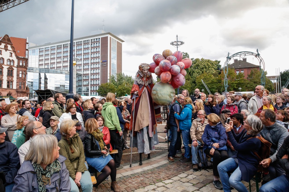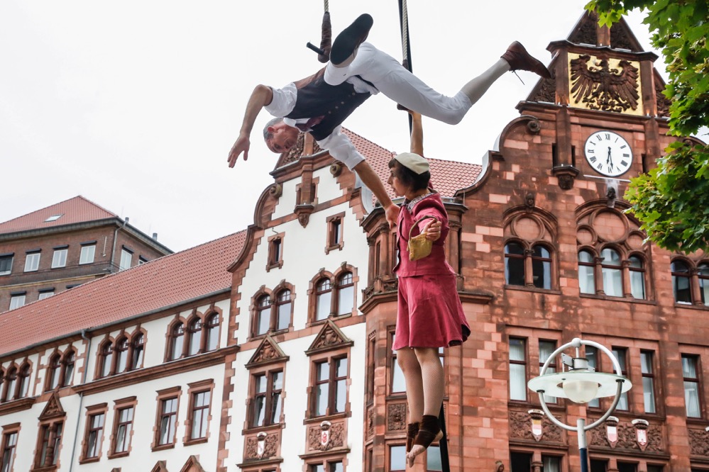 Mit einer sensiblen Verbindung aus Masken- und Körpertheater inklusive Stelzenartistik erzählte die portugiesische Theatergruppe „Teatro só“ die herzzerreißende Geschichte eines alten Paares, dessen innige Liebe auch nach dem Tod weiter anhält. Zum Abschluss des zweiten Festivaltages versetzte die große Zirkusshow von „Les P’tits Bras“ aus Frankreich das Publikum mit atemberaubender Flugkunst in Erstaunen.