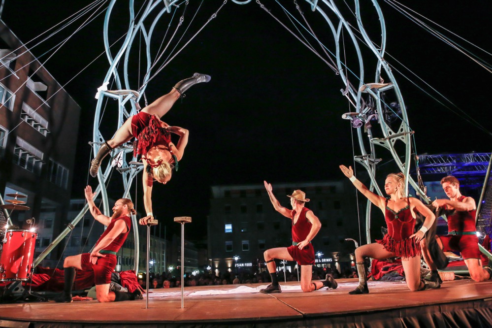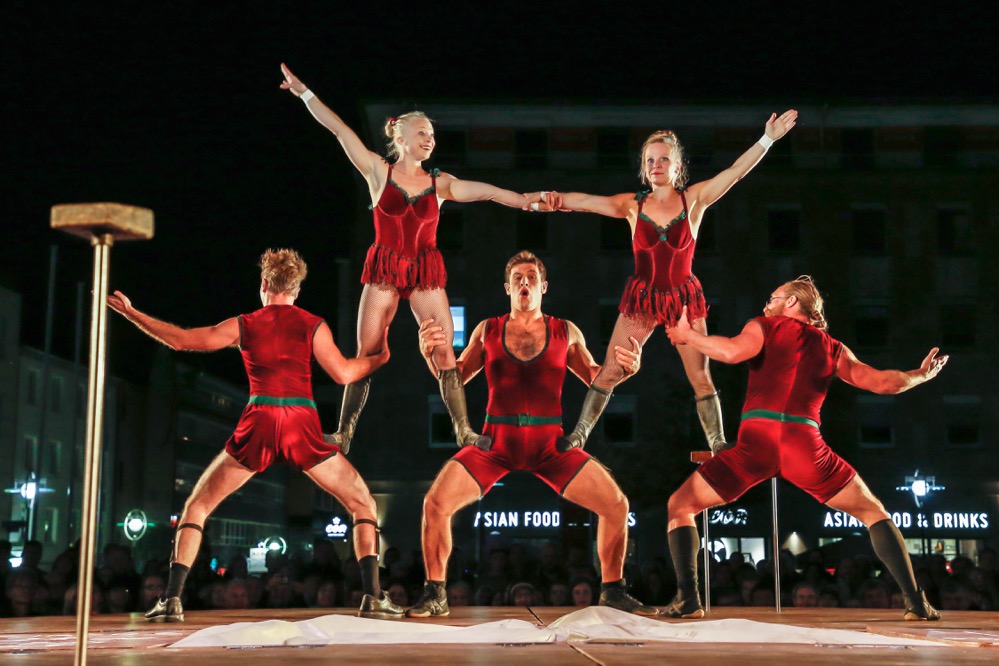 „Welcome to the circus!“: Die Gruppe „Les P’tits Bras“ aus Frankreich faszinierte auf dem Friedensplatz.