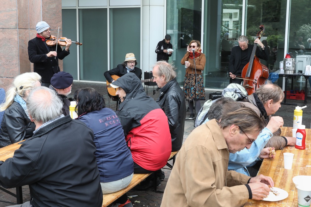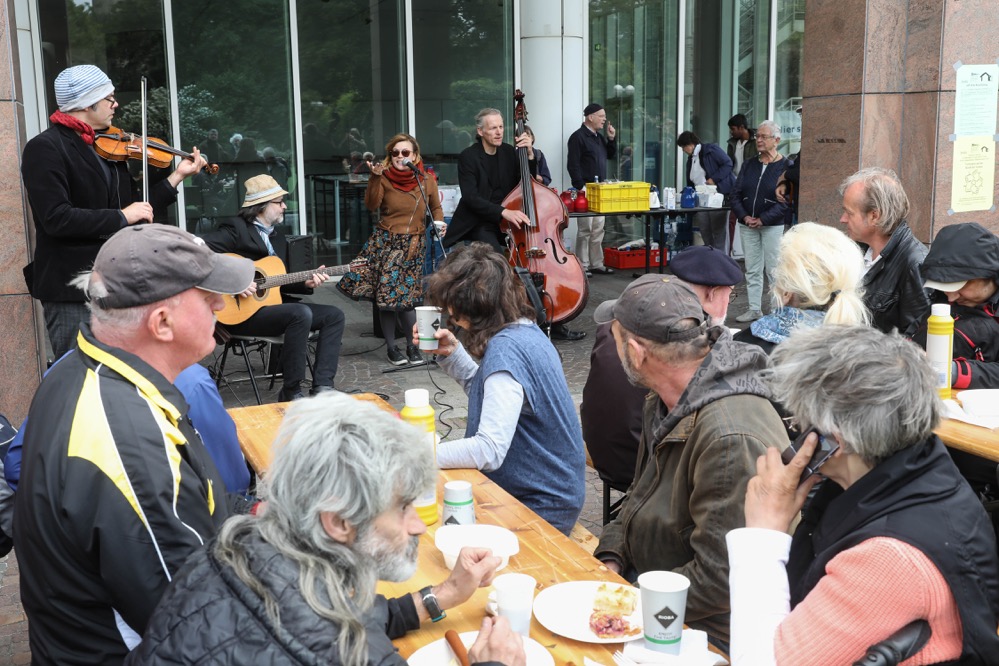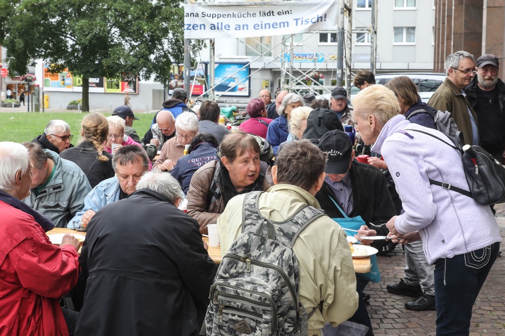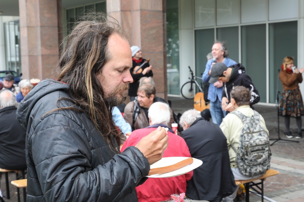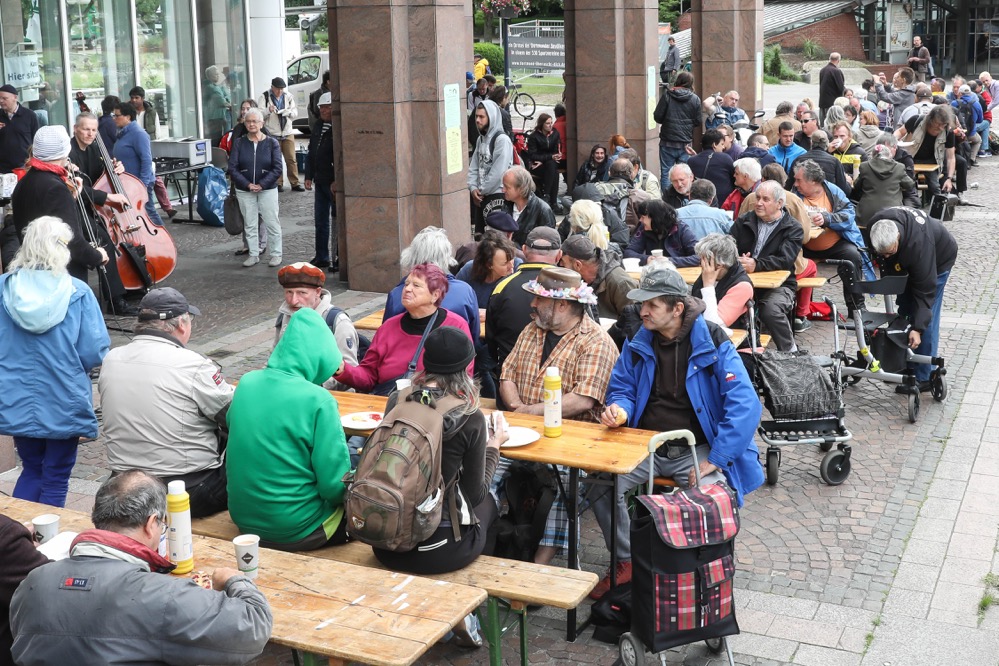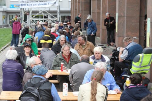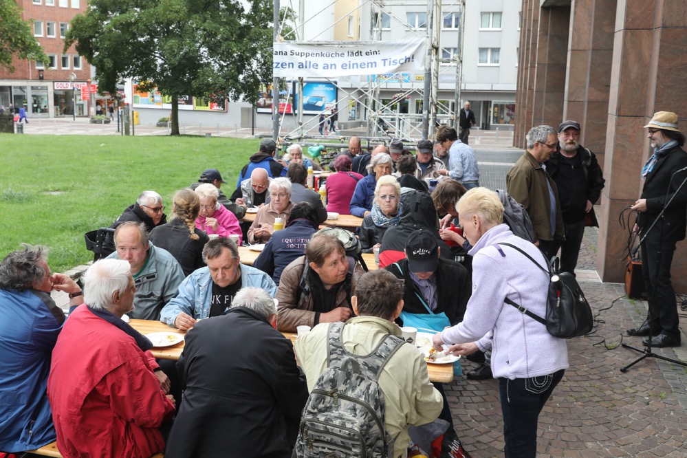 Die öffentliche Suppenküche am Rathaus von Dortmund war in diesem Juni wieder von Livemusik begleitet, die die Anwesenden begeisterte. Getränke, Kartoffelsalat mit Würstchen und anschließend Kaffee und Kuchen sorgten für das leibliche Wohl der zahlreich erschienen Menschen am Rathaus.