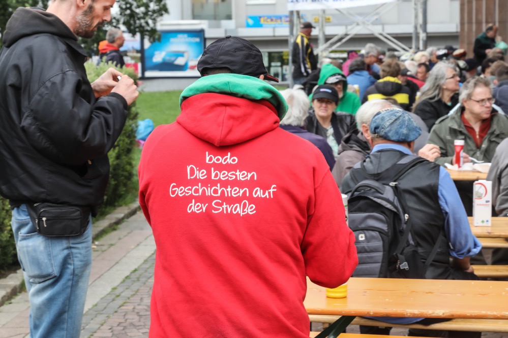 Ähnlich einem Symbol für den Zustand unserer Gesellschaft gegenüber denen, die „hinten rübergefallen sind“, war es an diesem Samstag in Juni kalt und windig. Aber mit den ersten ausgeteilten Mahlzeiten brach die Sonne wärmend durch und der Wind ließ nach.