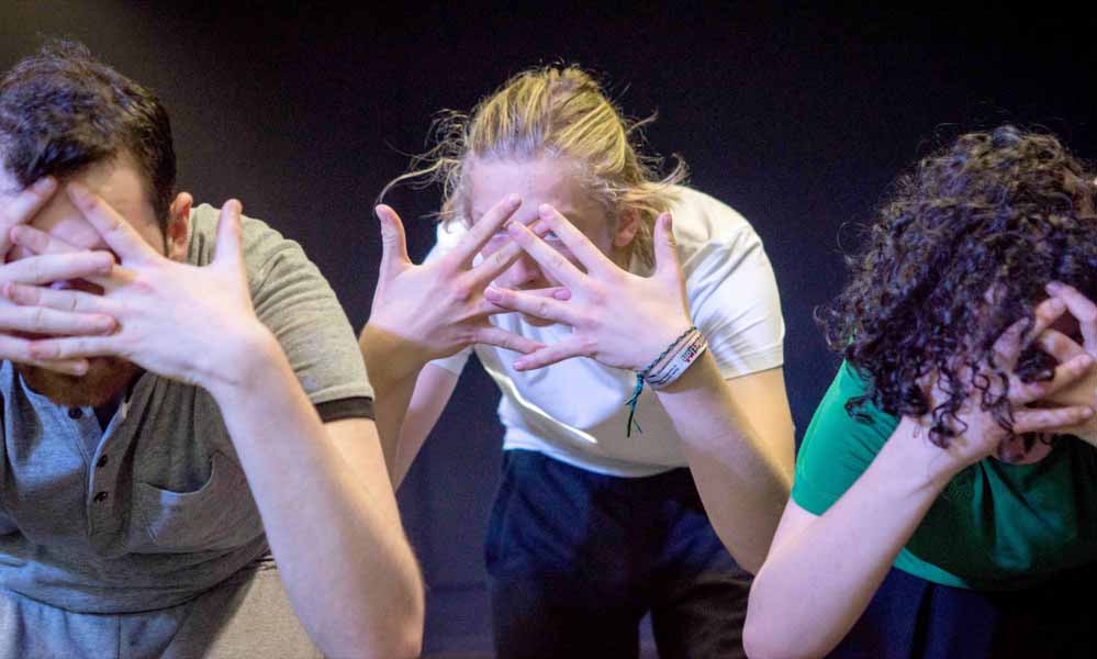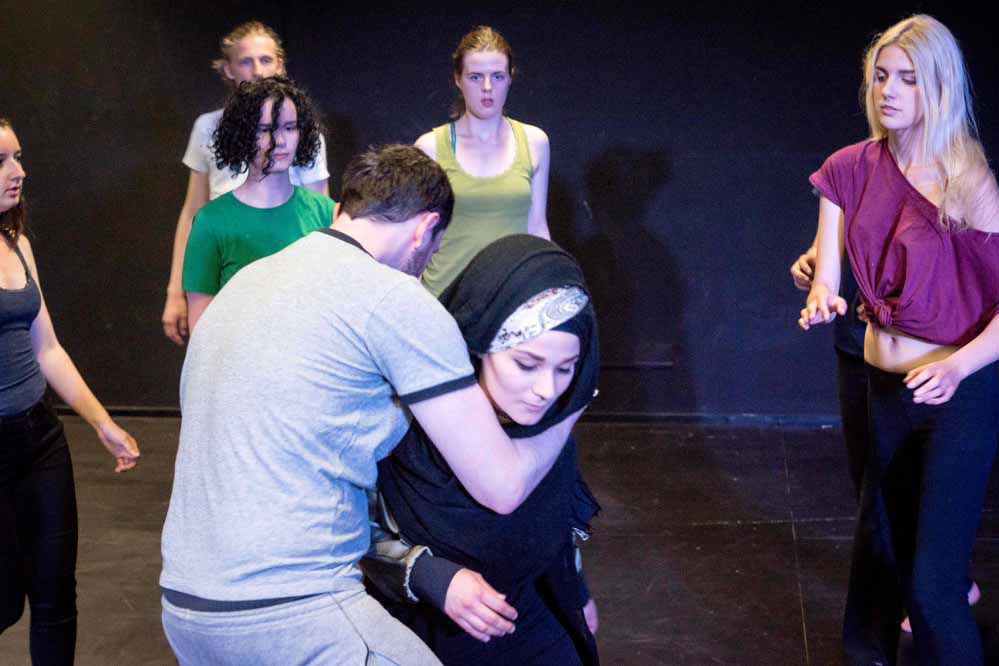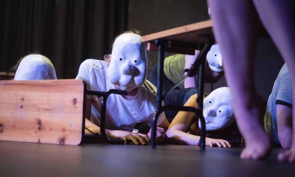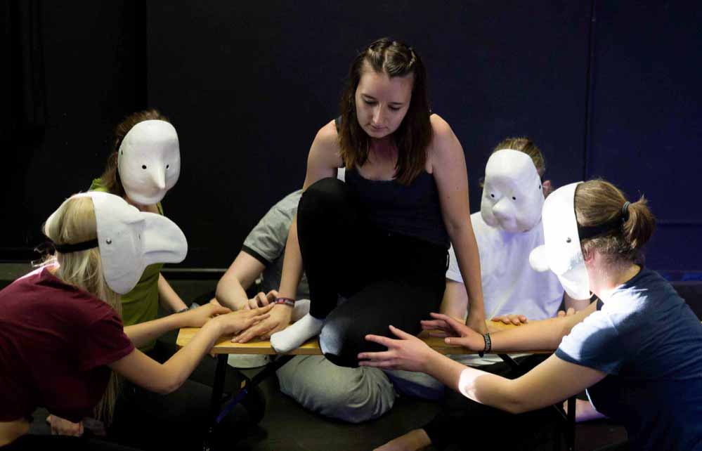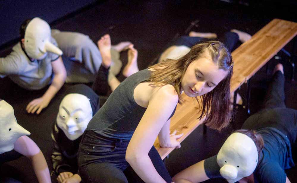 Für die, die sich das nicht so ganz vorstellen können: „Ein Mädchen steht auf der Bühne, spricht über die Ängste in Gruppen. Dann kommen die Masken und bewegen sich auf sie zu, und sie sagt: Mit denen soll ich eine Gruppe bilden? Wir haben auch einen gewissen Grad an Komik in das Stück hineingebracht“, lächelt er. „Es ist so: wir haben eine Bühne und zehn bis zwölf Spieler. Und diese Spieler erzeugen dann die Bilder.“