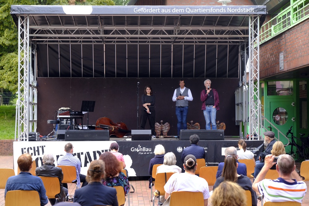 Zunächst wurde die das erste Mal zum Einsatz kommende „Echt-Nordstadt-Bühne“ von Andreas Koch von der Grünbau GmbH vorgestellt. Sie wurde aus Mitteln des Quartiersfonds Nordstadt finanziert. Dafür dankte Koch zunächst Levent Arslan, dem Direktor des Dietrich-Keuning-Hauses. ___STEADY_PAYWALL___