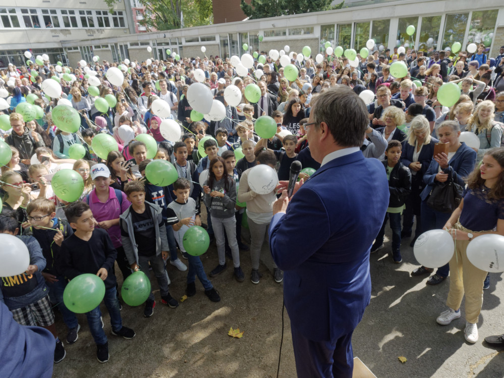 Zum Abschluss des Besuchs richtete Laschet sein Wort an die gesamte, auf dem Schulhof versammelte Schülerschaft, bedankte sich für den Empfang und gab den Start-Countdown, um 475 Ballons in den strahlend blauen Himmel über Dortmund steigen zu lassen: einen für jedes Jahr, das die Schule auf dem Buckel hat.