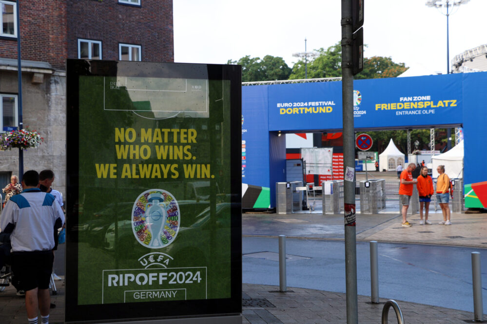 Diese Europameisterschaft war vieles: emotional, nass und vor allem teuer. Die Gruppe „Dies Irae“ hat mit einer Plakat-Aktion Kritik an der UEFA geübt. „Anlass der Aktion ist die verlustreiche Ausrichtung der EM, wobei die UEFA mit einem Milliarden-Gewinn rechnen kann. Auf dem Plakat ist der ikonische Pokal abgebildet, der vor Geldscheinen positioniert wurde.