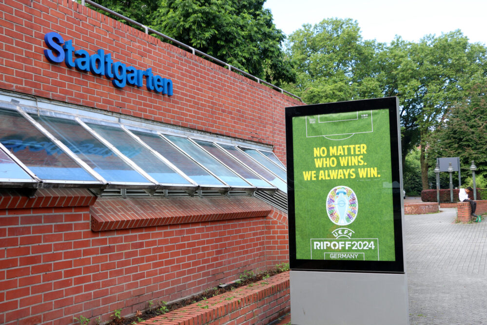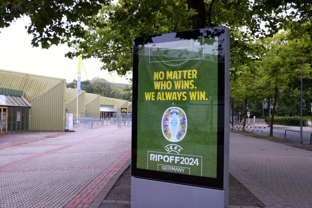 Das Plakat verkündet den eigentlichen Gewinner der EM – nämlich die UEFA, deren Logo mit Währungszeichen abgewandelt wurde“, so die Gruppe in einer Pressemitteilung. Die Stadt ließe sich über den Tisch ziehen. Fanmeilen müssen organisiert und selbst gezahlt werden. Die UEFA beteilige sich nicht an diesen Kosten, erklärt „Dies Irae“ weiter.