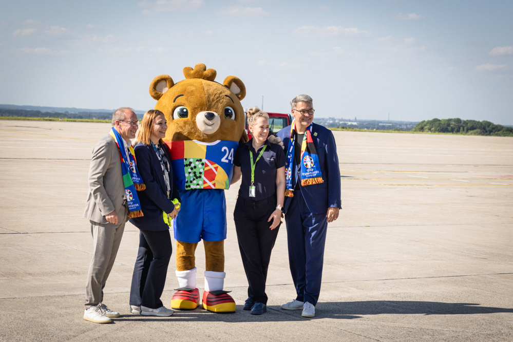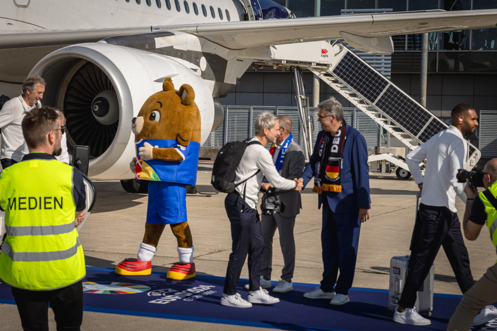 Darüber hinaus statteten die türkische, dänische, niederländische und englische Mannschaft dem Flughafen Besuche ab. Besonderes Highlight war für viele heimische Fans die Ankunft des DFB-Teams zum EM-Achtelfinalspiel gegen Dänemark. Passend zum Event präsentierte sich auch das Terminal in festlicher EM-Optik. Neben zahlreichen dekorativen Elementen sorgten ein XXL-EM-Pokal und EM-Maskottchen Albärt zuweilen für Fußballstimmung unter Reisenden und Besuchern.