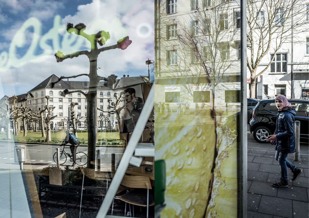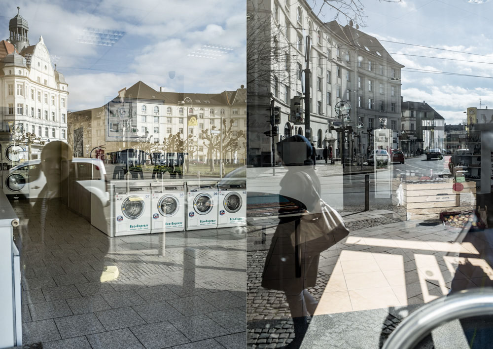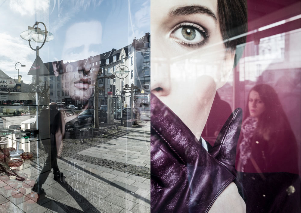 Die Sicht in die Schaufensterscheiben am Platz zeigt auf den Bilder durch die Spiegelungen gleichzeitig Innen- und Außenleben, jedoch so sehr miteinander verwoben, dass es dem Betrachter schwer fällt, zu erkennen was nun hinter, beziehungsweise vor der Glas passiert.
