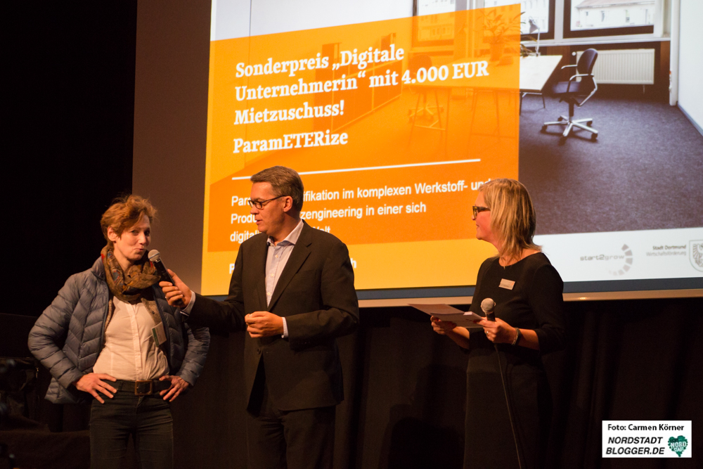 Diesen Abend gab es außerdem drei Sonderpeise: Den Sonderpreis „Digitale Unternehmerin“ im Wert von 4.000 Euro gewann Prof. Dr. Heike Emmerich für ihre Systemsoftware „ParamETERize“ – eine Technik, welche Prozessparameter systematisch digitalisiert und als visuelle Ergebnisdarstellung für das Smartphone präsentiert.