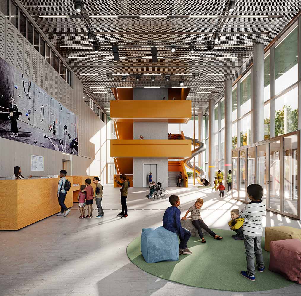 Der markante Neubau verbindet moderne Architektur mit Offenheit: Ein großzügiges, gläsernes Foyer öffnet das Gebäude zur Stadt hin und schafft ein Forum für junge Kunst, Bildung und Teilhabe.