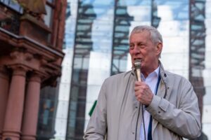 Dann tritt der 69-Jährige auf den Friedensplatz. Zur Überraschung gibt es ein Hupkonzert, gefolgt von einem eigens für ihn komponierten Lied. „Der Dirigent von Dortmund“, heißt es darin, „vom Konzerthaus bis zum Dortmunder U, Oper, Theater, die Junge Bühne dazu.“ Die Zeilen spiegeln wider, was Stüdemann in über zwei Jahrzehnten für die Stadt Dortmund, besonders für die Kulturszene, bewegt hat. Als das Lied endet, bleibt er sichtlich gerührt zurück. Und ihm fehlen erst einmal die Worte. Ein schönes Bild – dem langjährigen Kümmerer und Kämmerer der Stadt Dortmund, fällt zum Ende seiner Amtszeit „nichts mehr ein“.