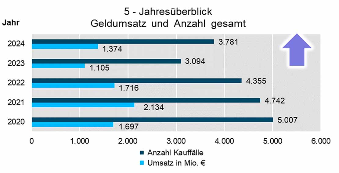 Mehr Verkäufe bedeuten auch mehr Umsatz. Er stieg um rund 24 Prozent auf 1,37 Milliarden Euro. Allerdings liegt auch dieser Wert immer noch deutlich unter dem Höchstwert von mehr als zwei Milliarden Euro im Jahr 2020. „Die Revitalisierung des Grundstücksmarkts betrifft erfreulicherweise alle Teilmärkte“, berichtet Meyer-Dietrich.