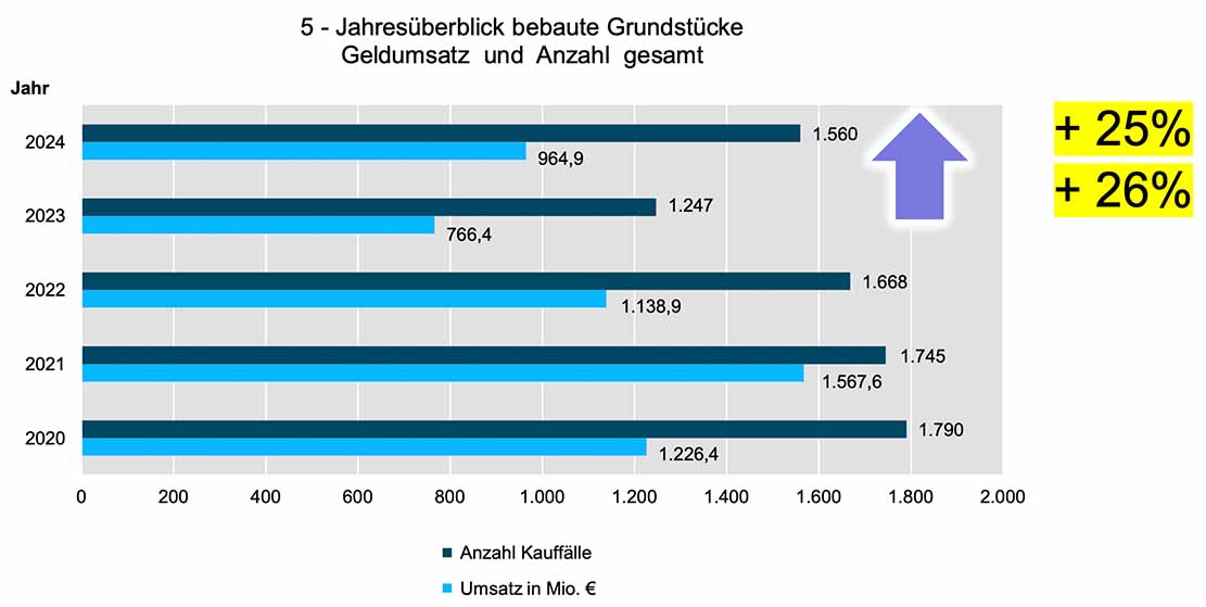 Der positive Trend ist auch bei den bebauten Grundstücken (ohne Wohnungs- und Teileigentum) zu erkennen. Anzahl und Umsatz sind um 25 Prozent gestiegen. Während bei Ein- und Zweifamilienhäusern die Anzahl der Grundstückstransaktionen sowie auch der Geldumsatz jeweils um mehr als 20 Prozent stieg, zeichnet sich bei Mehrfamilienhäusern ein Plus bei den Verkäufen von 26 Prozent ab und 50 Prozent mehr Umsatz.