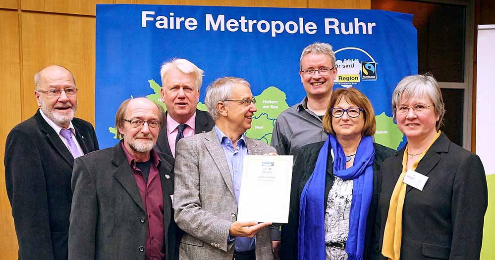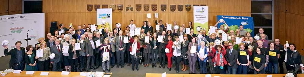 Bei der Feier der Titelerneuerung im Sitzungssaal des Ruhrparlaments beim Regionalverband Ruhr in Essen erhielten 30 Kommunen, ein Kreis, der RVR und das Netzwerk Faire Metropole Ruhr erneut ihre Auszeichnungsurkunden. Dieter Overath, Geschäftsführer von Fairtrade Deutschland lobte das besondere Engagement im Revier für Fairen Handel und weltweite Gerechtigkeit.