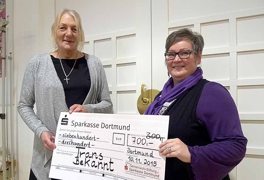 Zu Beginn überreichte die Gemeinwohlstiftung der Sparkasse Dortmund einen Scheck über 1000 Euro an die Organisation TransBekannt e.V. Die Organisation möchte mit der Spende vor allem die „dringend notwendige Öffentlichkeitsarbeit deutlich verbessern“, betont die Vorsitzende Mandy Walczak.