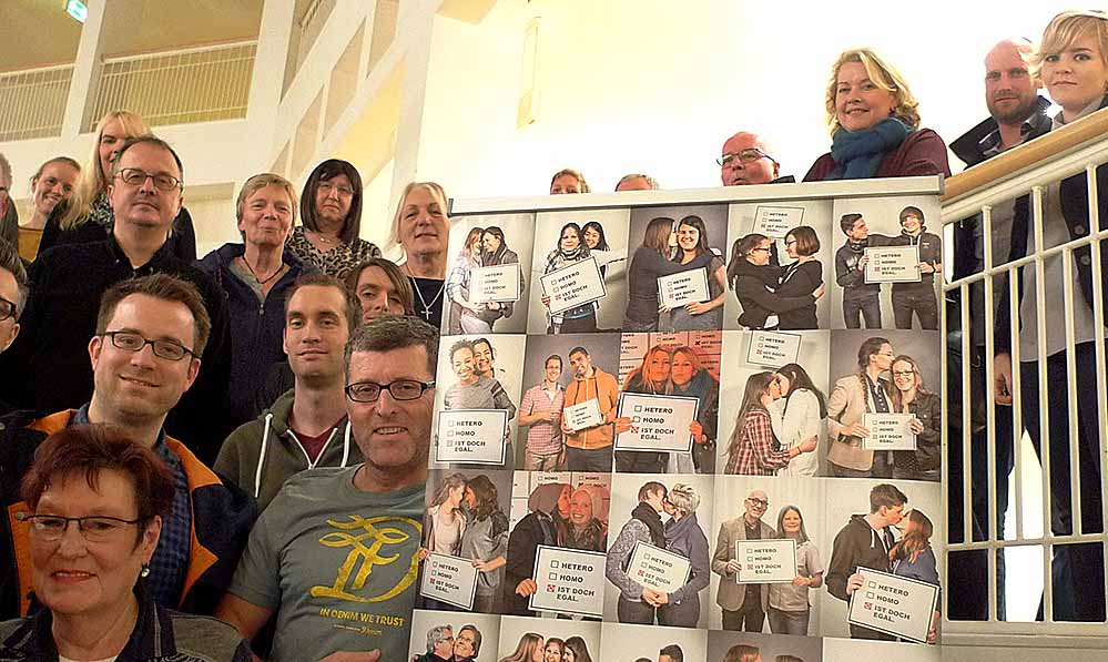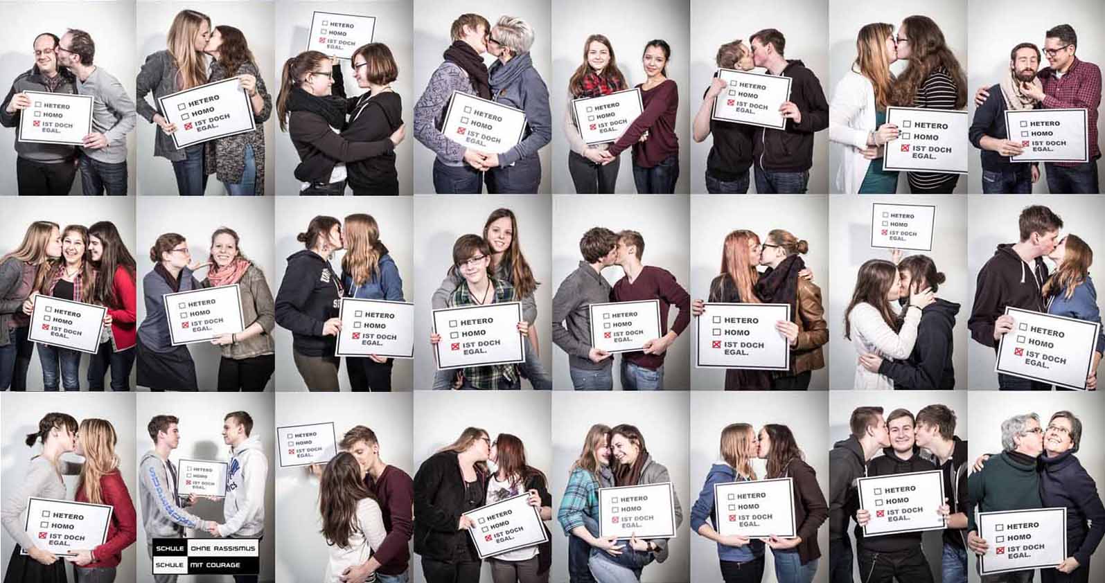Schülerinnen und Schüler, Lehrerinnen und Lehrer des Bert-Brecht-Gymnasiums wollen mit der Fotoaktion ein Zeichen gegen Homophobie setzen und vertreten die Meinung: Homo, Hetero ist doch egal!