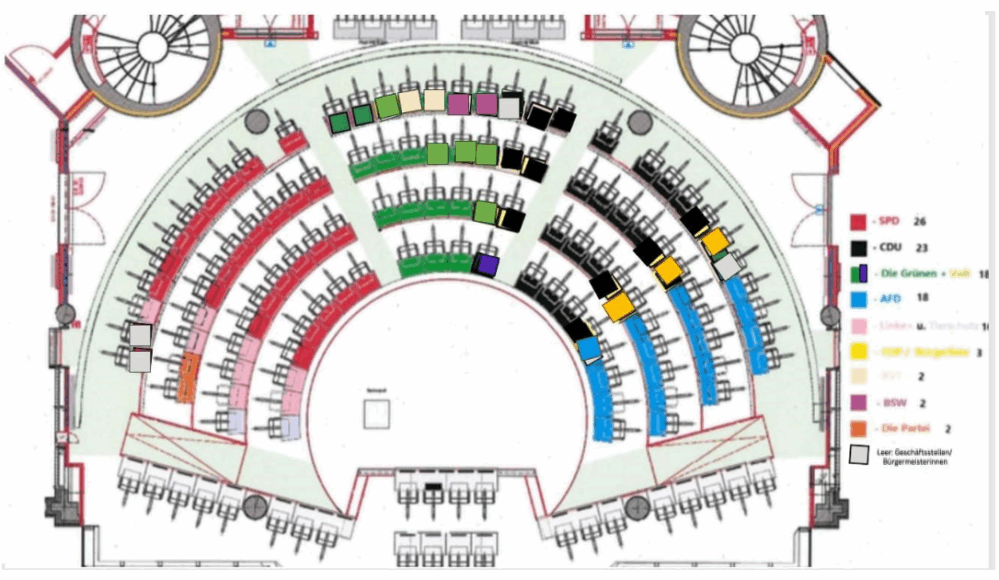Nach rund 16 Stunden und zwei verschiedenen Sitzungstagen ist die konstituierende Sitzung des neuen Rates vorbei. Jetzt stehen die Mitglieder als Ausschüsse und Beiräte, die in langwierigen Verfahren gewählt werden mussten. Außerdem ging es auch in der fortgesetzten konstituierenden Sitzung am 27. November 2025 um die Sitzordnung und den Brandmauer-Beschluss.