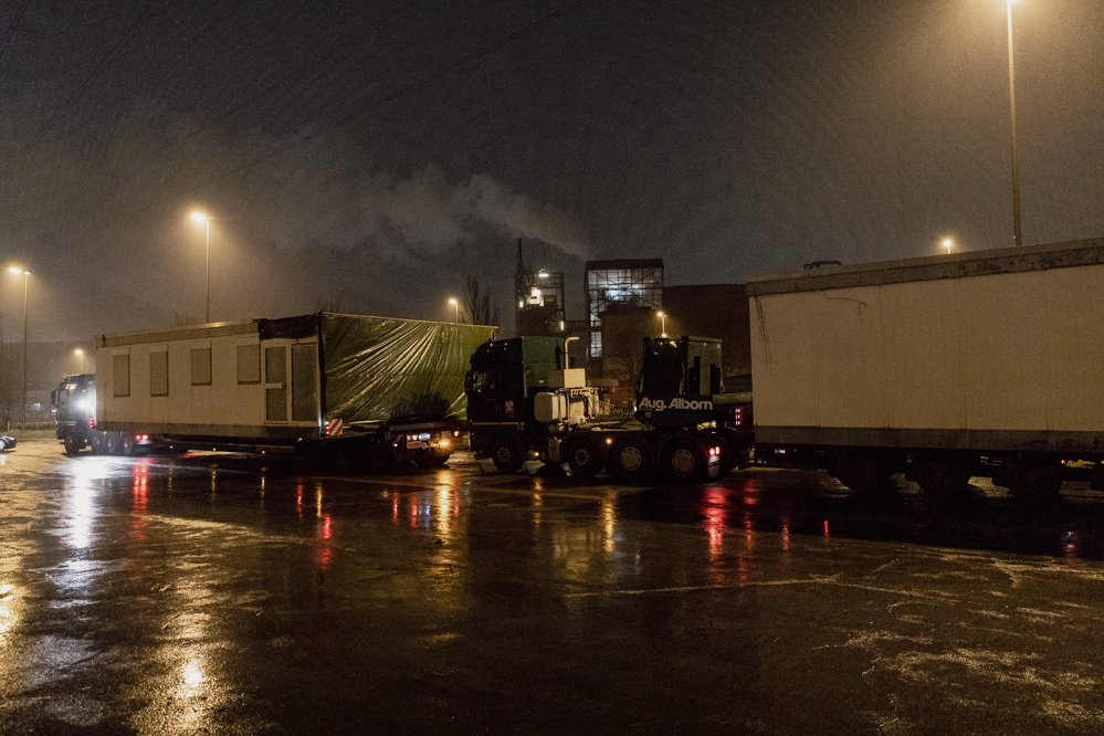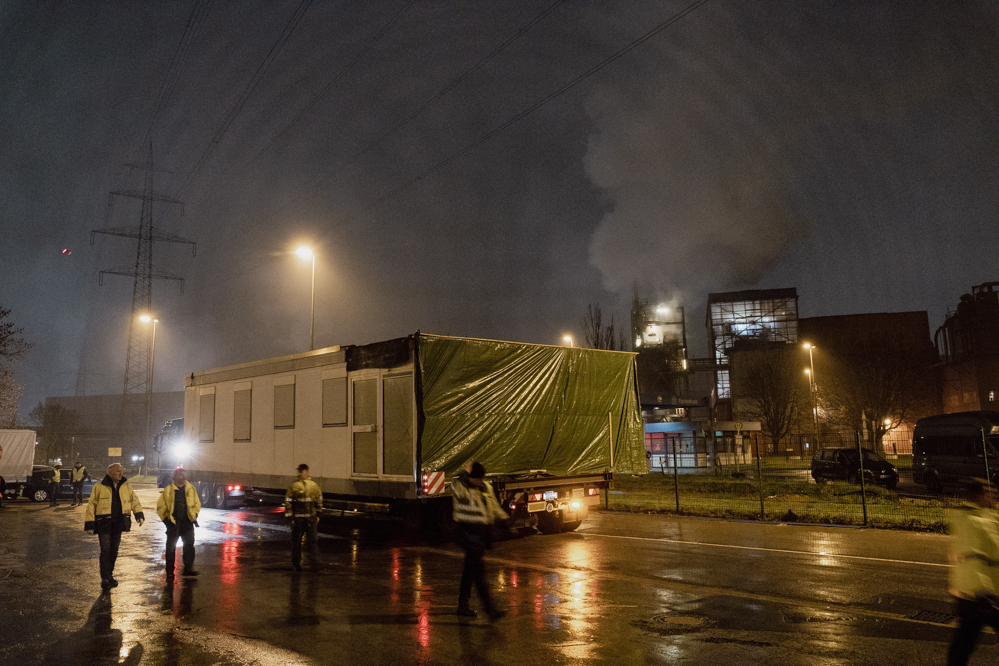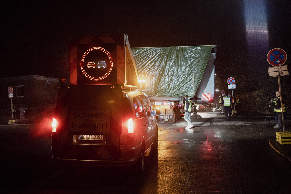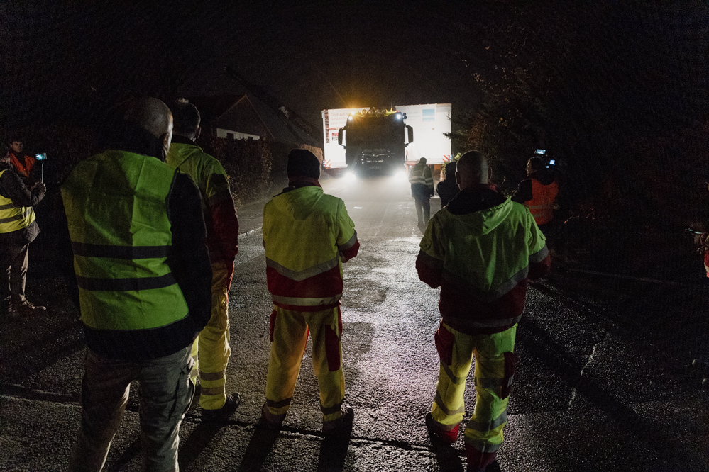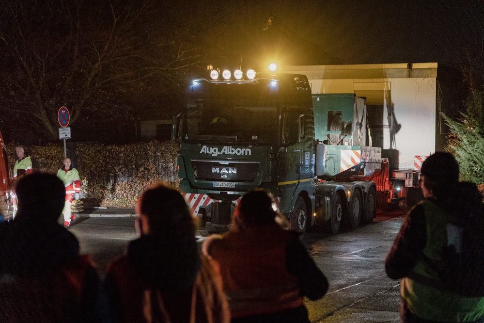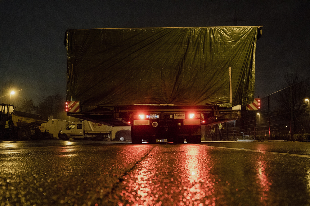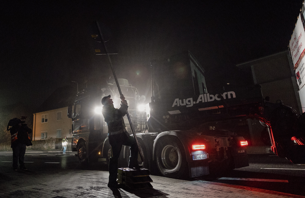 Für die knapp 13 Kilometer bis zum Werksgelände sind vier Stunden geplant. Der Konvoi schafft die Strecke schließlich mit durchschnittlich Tempo 30 in drei Stunden und erreicht Tor 4 und seinen Zwischenstopp gegen drei Uhr morgens.