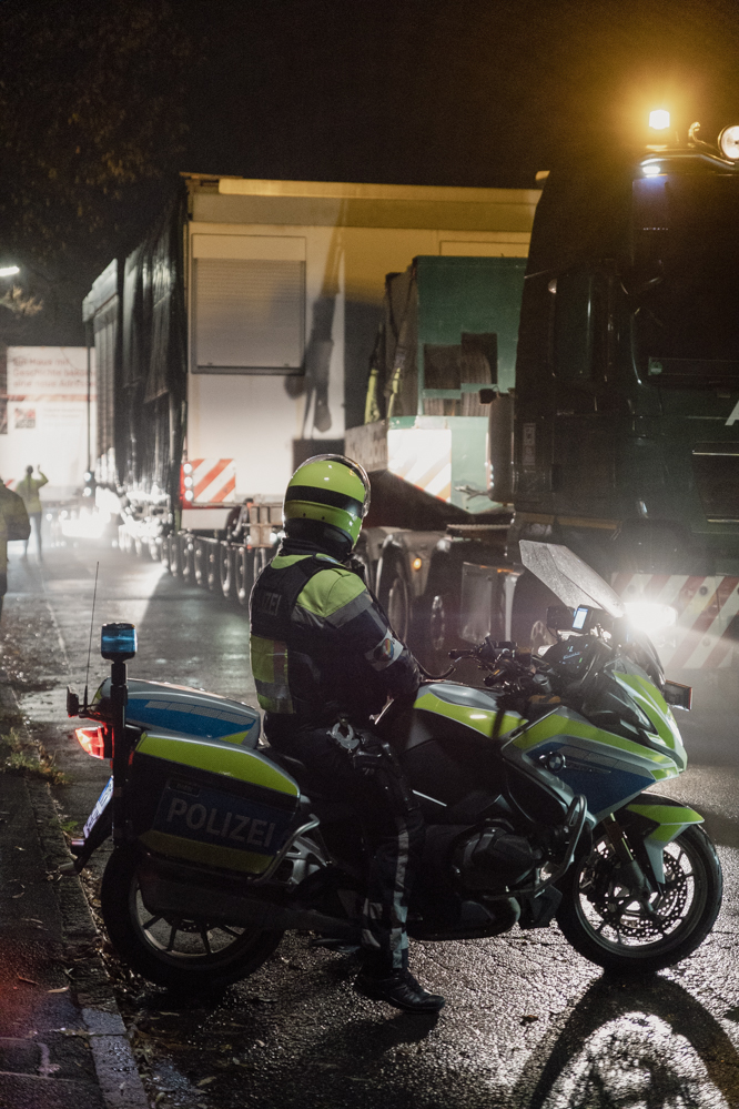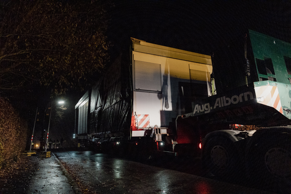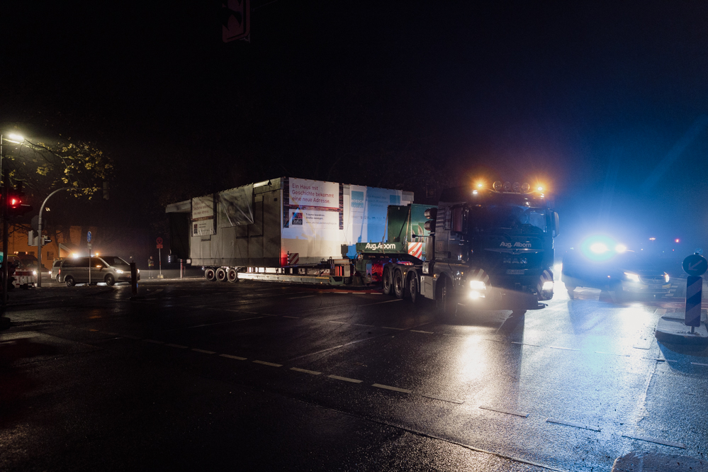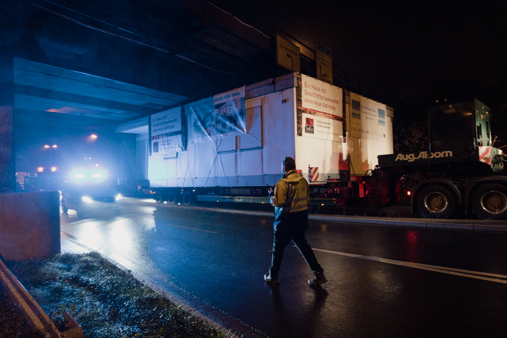 Der Transport der beiden Haushälften beginnt um Mitternacht in einem beschaulichen Wohngebiet. Die beiden Teile wiegen 13 und 16 Tonnen, sind bis zu acht Meter breit und werden auf den Spezialtiefladern platziert.