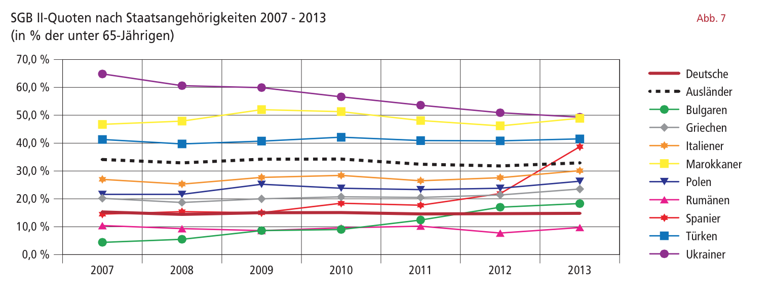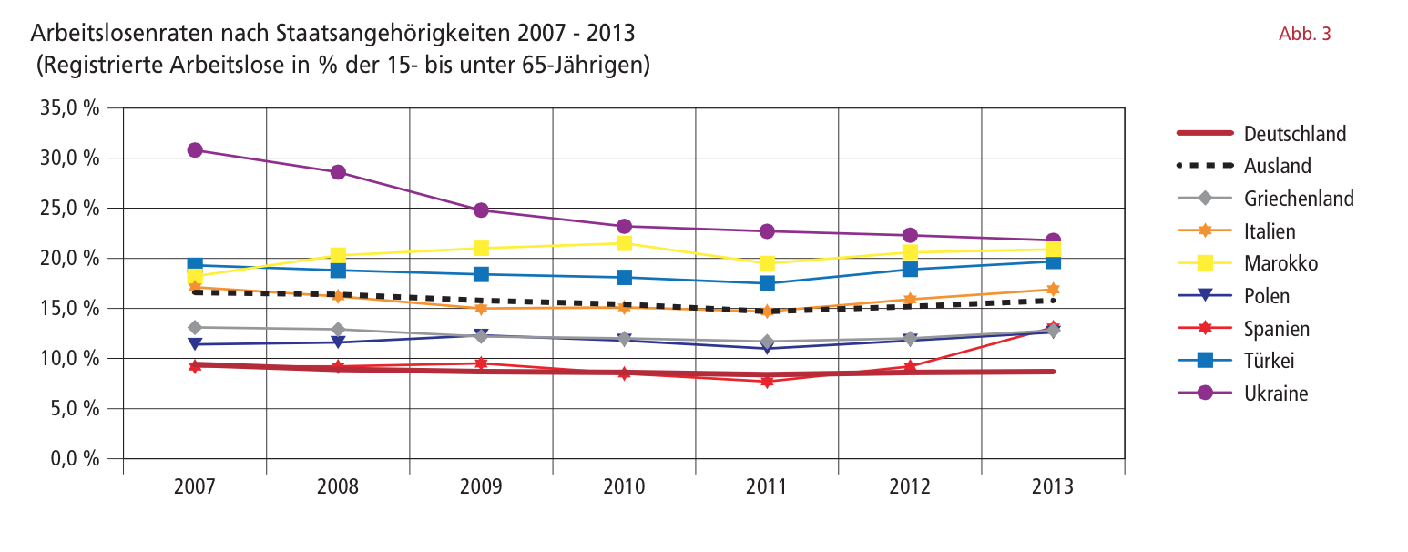 Die Arbeitslosenraten sind mit ca. 20 Prozent vergleichsweise hoch bei ukrainischen, marokkanischen und türkischen Staatsangehörigen, bei den spanischen Staatsangehörigen dagegen erst seit 2013 höher als bei den Deutschen.