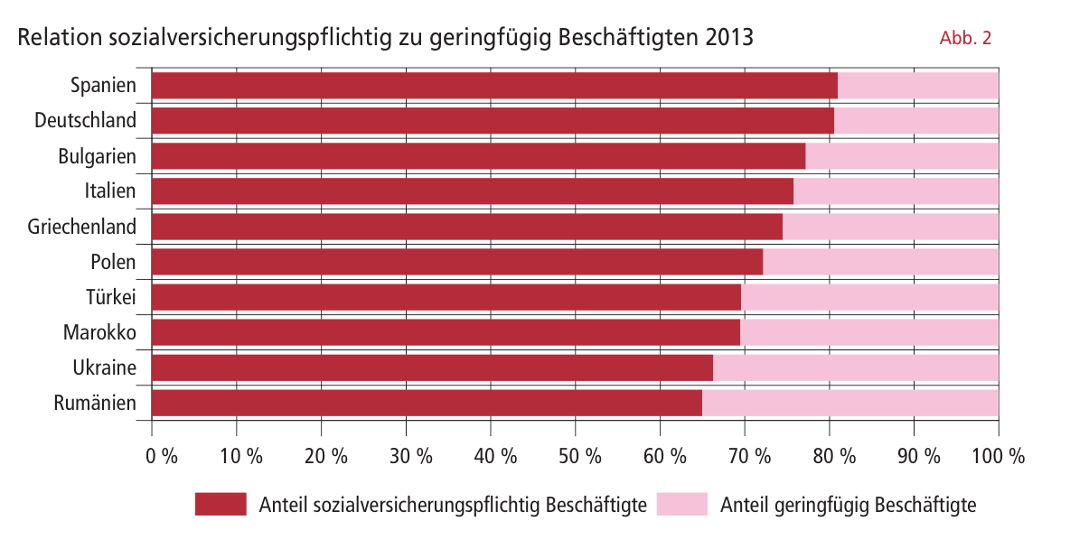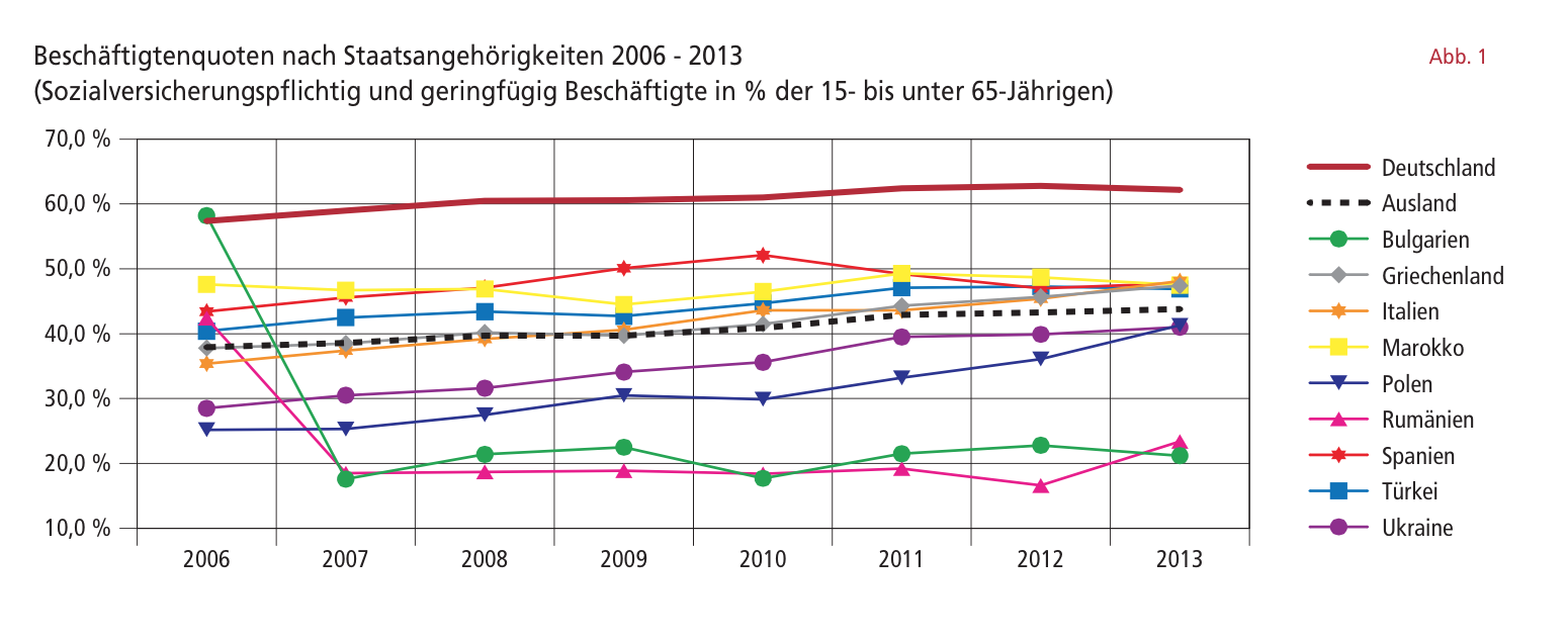 Die polnischen und ukrainischen Staatsangehörigen haben 2013 die 40%-Quote überschritten. Dabei verzeichnen die Polen mit einer um mehr als 16 Prozentpunkte höheren Quote den stärksten Anstieg seit 2006. Deutlich dahinter zurück bleiben – auch aufgrund der rechtlichen Restriktionen – die „jüngsten“ Zuwanderergruppen aus Bulgarien und Rumänien.