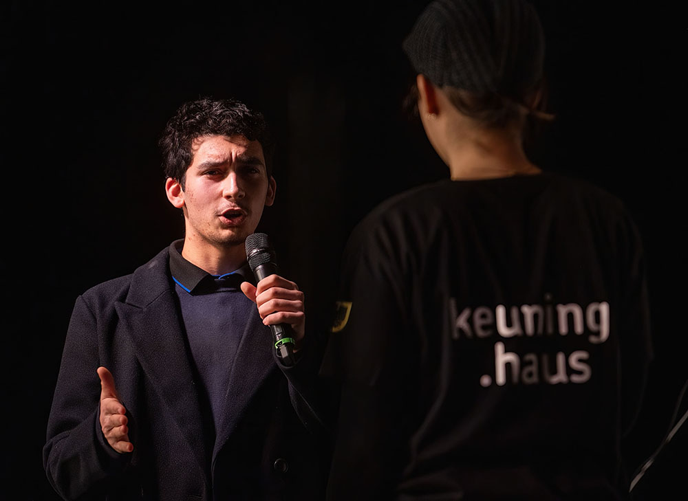 Einen erfrischenden Einblick in das kulturelle Leben bot dann ein buntes Bühnenprogramm. Eine Gruppe junger Erwachsener vom Unternehmen.Bilden.Vielfalt (UBV) e.V. brachte ein selbstgeschriebenes Theaterstück auf die Bühne, in dem der 1980 verstorbene Dietrich Keuning in der Jetztzeit jenes Haus besucht, das seinen Namen trägt. Darin eingeflochten drückte ein Zitat des antiken Griechen Perikles gut aus, um welche Qualität man im Keuning Haus stets bemüht ist: „Das Geheimnis des Glücks ist die Freiheit, und das Geheimnis der Freiheit ist der Mut!“