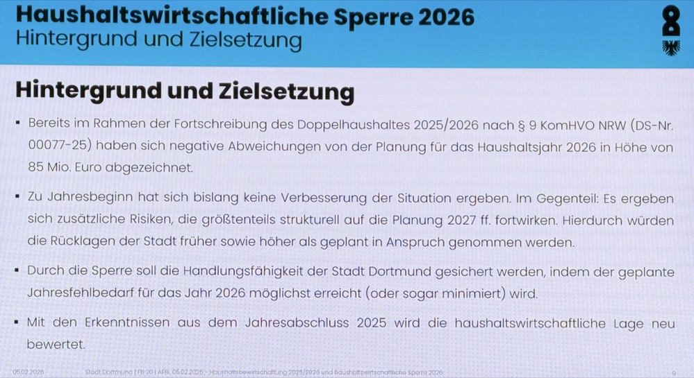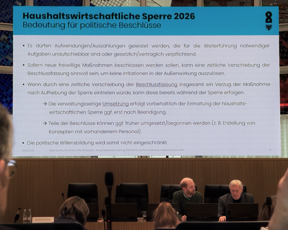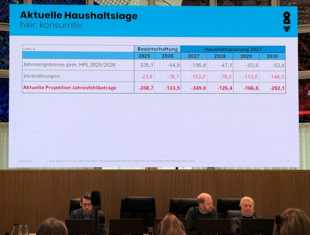 Die finanzielle Entwicklung der Stadt Dortmund weicht zunehmend von den Annahmen ab, auf denen der Doppelhaushalt 2025/2026 basiert. Neue Berechnungen der Kämmerei zeigen, dass sich die Haushaltslage schneller und stärker verschlechtert als erwartet. Vor diesem Hintergrund haben Kämmerer und Oberbürgermeister eine haushaltswirtschaftliche Sperre bis zum 31. März 2026 verhängt, um finanzielle Risiken zu begrenzen und die Handlungsfähigkeit der Stadt zu sichern.
