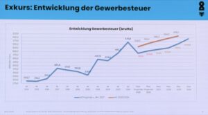Ein Ausgleich über den Gemeindeanteil an der Umsatzsteuer könne diese Effekte nicht vollständig kompensieren. Trotz eines Rekordjahres 2024 mit rund 570 Millionen Euro Gewerbesteuer verschlechtere sich damit die mittelfristige Perspektive.