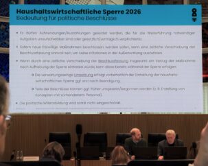 Nach Angaben der Verwaltung werden dort derzeit Forderungen und Verbindlichkeiten in dreistelliger Millionenhöhe geprüft. Sollten sich daraus positive Effekte ergeben und ausreichend Mittel in der Ausgleichsrücklage verbleiben, könnte dies ungeplante Belastungen im Jahr 2026 zumindest teilweise auffangen. In diesem Fall wäre auch eine vorzeitige Aufhebung der Sperre denkbar.