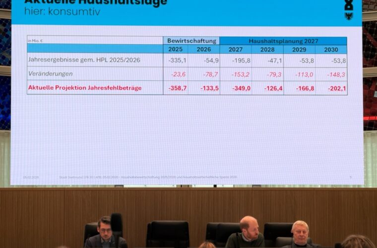 Die finanzielle Entwicklung der Stadt Dortmund weicht zunehmend von den Annahmen ab, auf denen der Doppelhaushalt 2025/2026 basiert. Neue Berechnungen der Kämmerei zeigen, dass sich die Haushaltslage schneller und stärker verschlechtert als erwartet. Vor diesem … Die Finanzlage verschärft sich deutlich – der Finanzausschuss diskutiert die Haushaltssperre weiterlesen