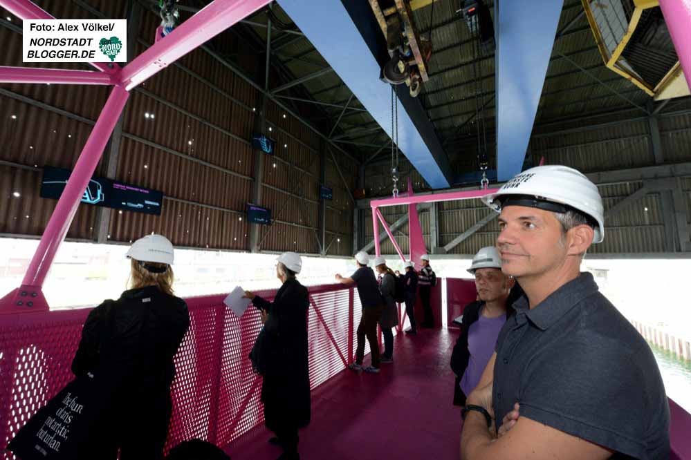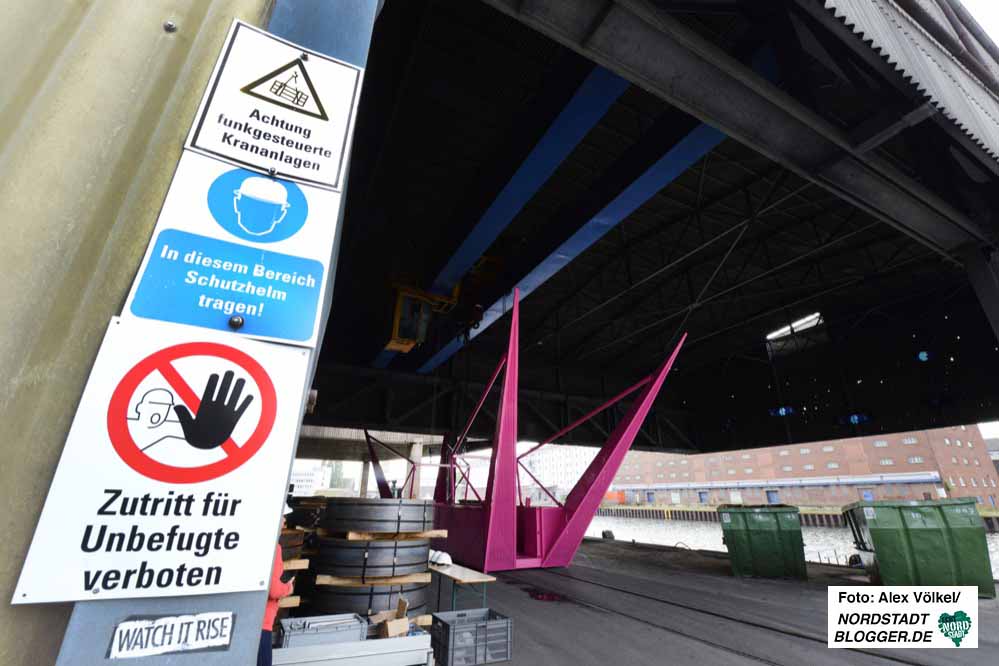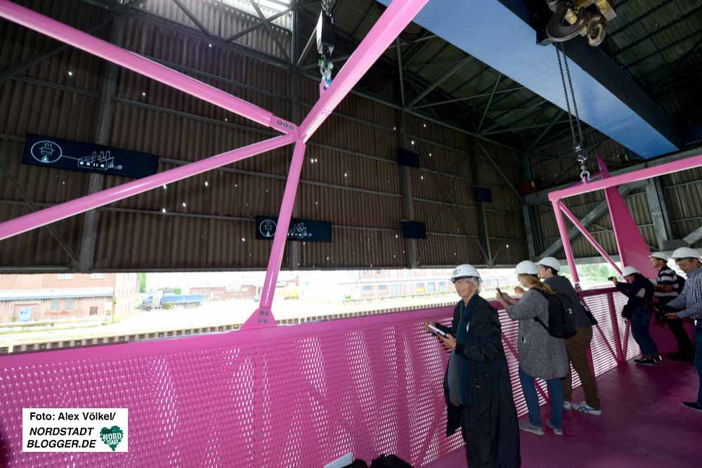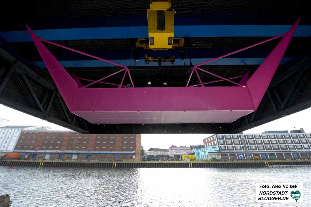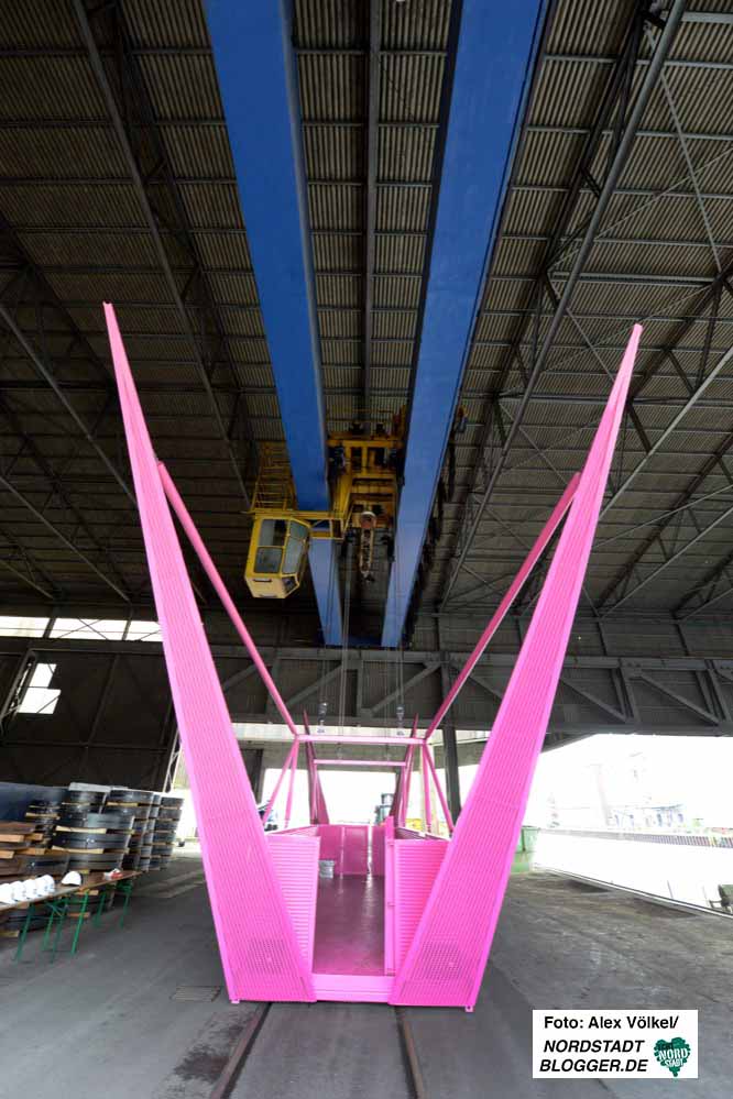 Diese „Kreatur“ aus Stahl in Erikaviolett krallt sich am Kran fest und bringt Menschen dorthin, wo sie noch nie waren und ohne diese Aktion auch nie hingekommen wären.