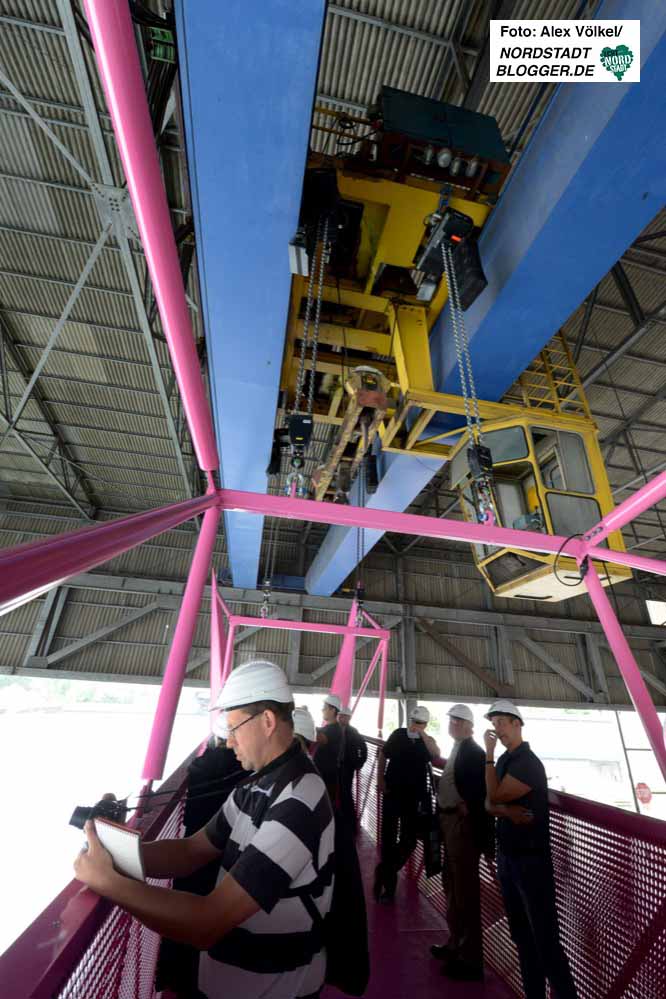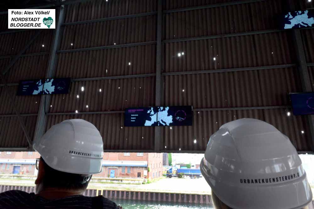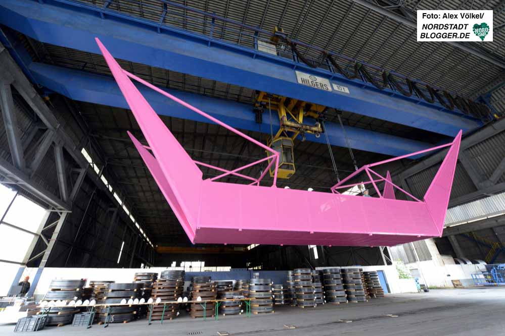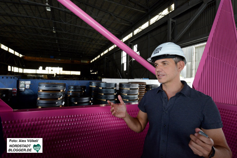 Das Raum- und Klangexperiment an dieser ungewöhnlichen Stelle gelingt, weil die Stahlfirma SAZ, die von hier aus jährlich 130 000 Tonnen Bandstahl auf die Welt(wirtschafts)reise schickt, ihre Katzen am Wochenende für die Kunst laufen lässt: samstags 10 – 20 Uhr, sonntags 10-18 Uhr, dreimal in jeder Stunde.