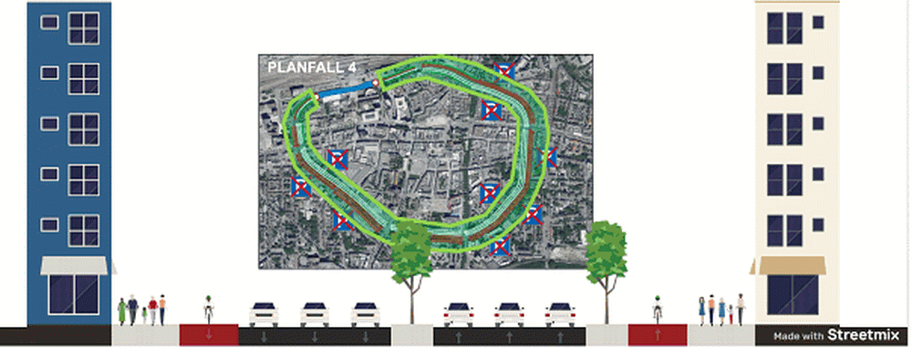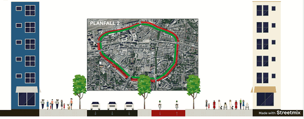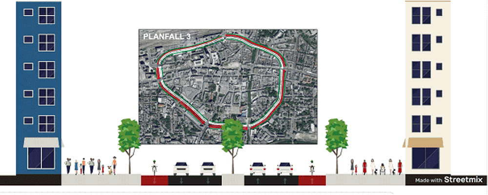 • Variante 2: Die inneren Richtungsfahrspuren werden zum Zweirichtungsweg für Radfahrer*innen und Fußgängerinnen. Die Äußeren Fahrspuren werden in dem Fall zu einer Einbahnstraße.