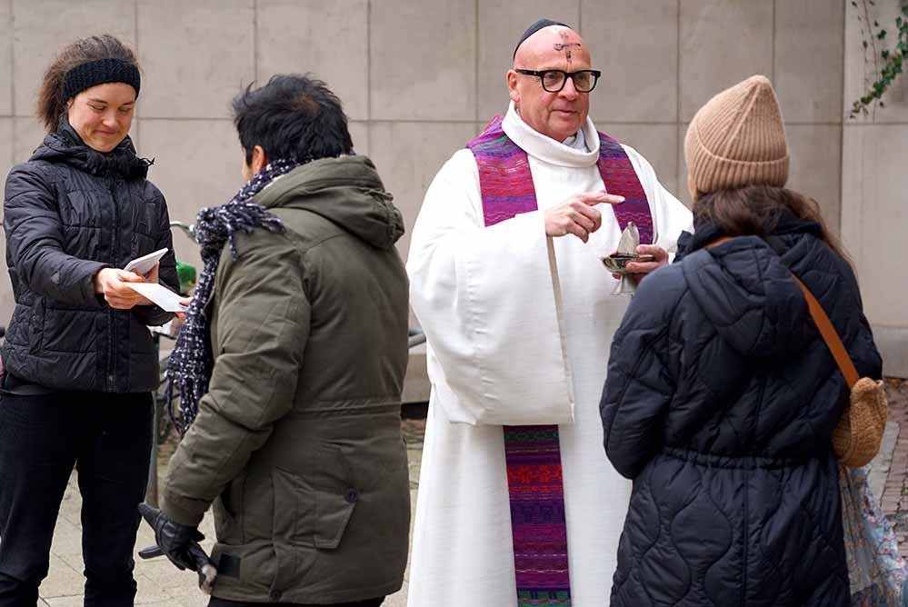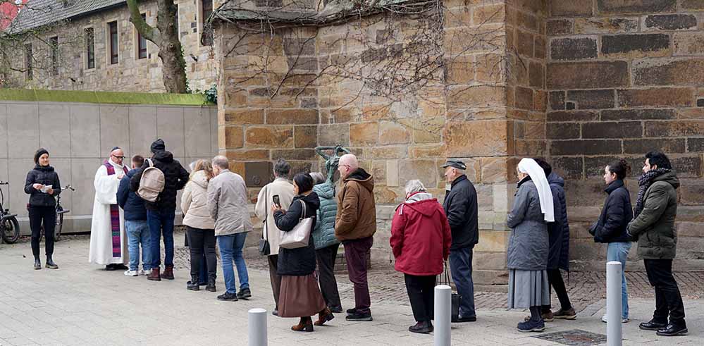 Eine lange Schlage aus Passanten und Teilnehmenden der „Messe zur Marktzeit“ in der Propsteikirche bildete sich am Aschermittwoch auf dem Platz von Hiroshima. Pastor Stefan Tausch vom Katholischen Forum verteilte dort am Aschermittwoch das Aschekreuz unter freiem Himmel. Thale Schmitz vom Katholischen Forum hatte außerdem für jede und jeden eine Karte mit einem Satz aus dem Markusevangelium dabei.