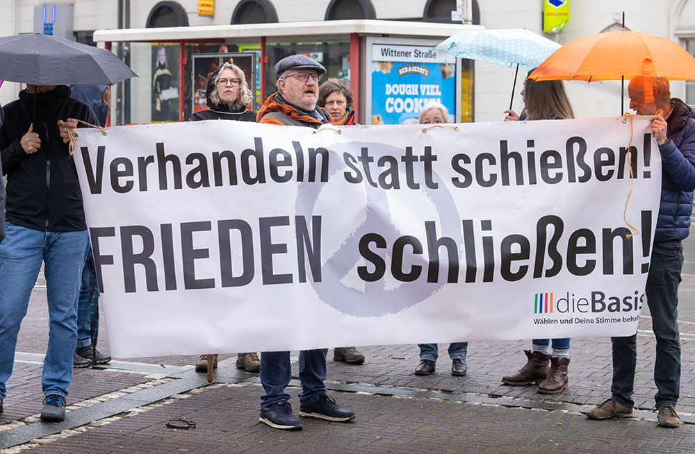 Selten erfuhr das Oberhaupt der Römisch-Katholischen Kirche, Papst Franziskus soviel Zustimmung von einem überwiegend säkular und politisch links ausgerichtetem Publikum, wie den gut 400 bis 500 Menschen, die die letzte Etappe des Ostermarsches Ruhr 2024 vom Dorstfelder Wilhelmplatz zum Hansaplatz in der City trotz der widrigen Wetterverhältnisse bestritten.