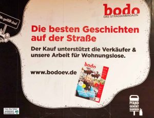 Für 2,50 Euro bekommt man im März eine zugezogene Archäologin, einen selbsternannten Drachentöter, selbstbewusste Straßenjugendliche, digitale Bergleute, zurückkehrende Zugvögel, deutschtürkische Kartoffeln, Hobby-Cineasten, Hartz-Sanktionen. Und das alles im Straßenmagazin „bodo“. Die Hälfte des Erlöses bleibt bei den VerkäuferInnen.