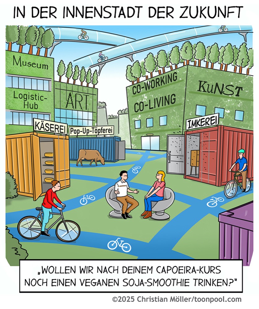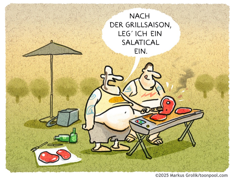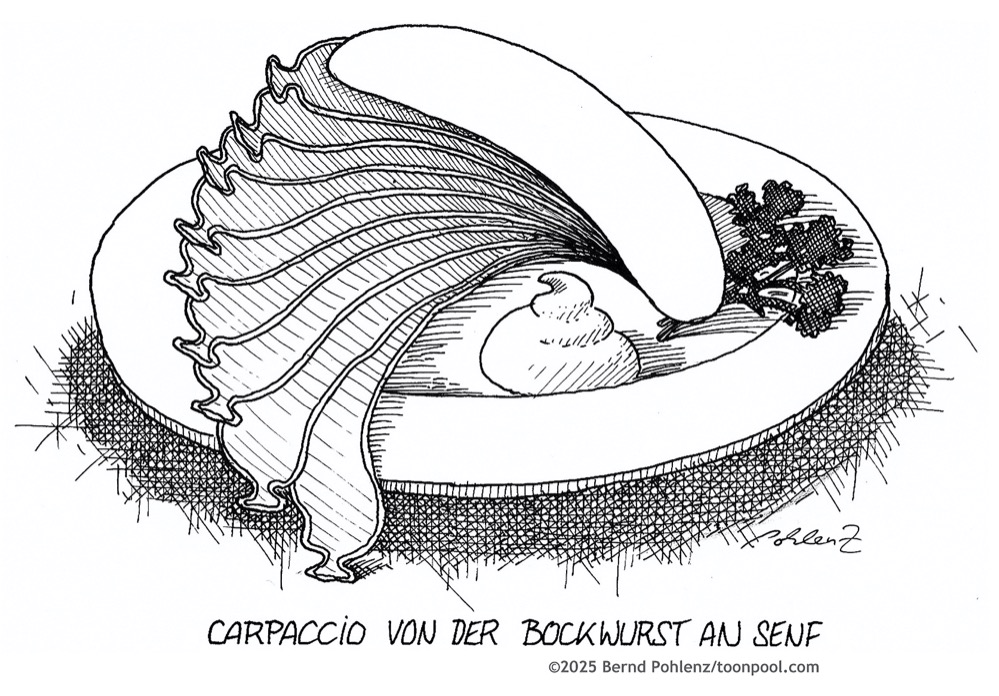 In ihren Zeichnungen schildern die Künter:innen ihre Eindrücke vom stilvollen Essengehen ebenso wie den Blick tief hinab in die Fast-Food-Niederungen. Josephine Mark bemängelt zum Beispiel in ihrem Cartoon verärgert, dass ein Kellner „Suppe an seiner Fliege hat“, während sich stämmige Barbecue-Grillfreunde bei Markus Grolik schwören, demnächst mal ein „Salatical“ einzulegen.