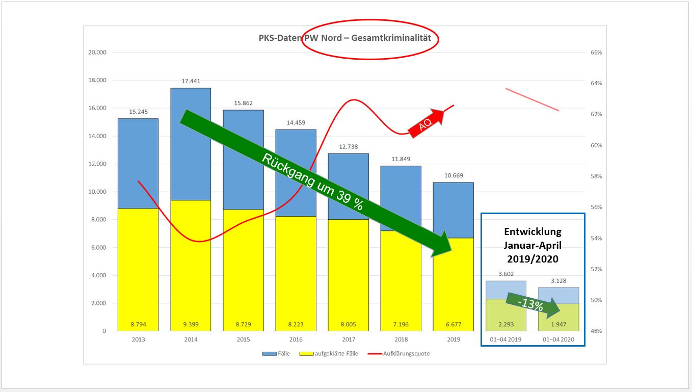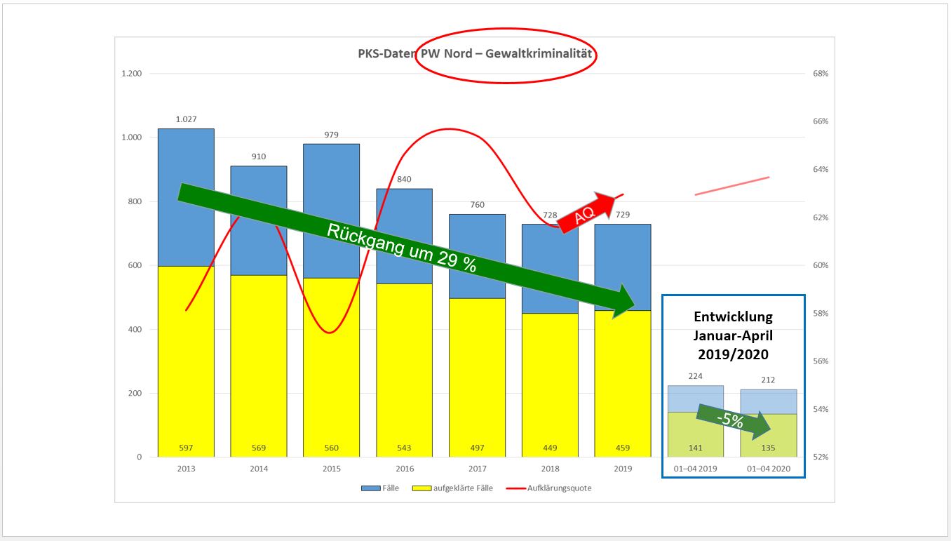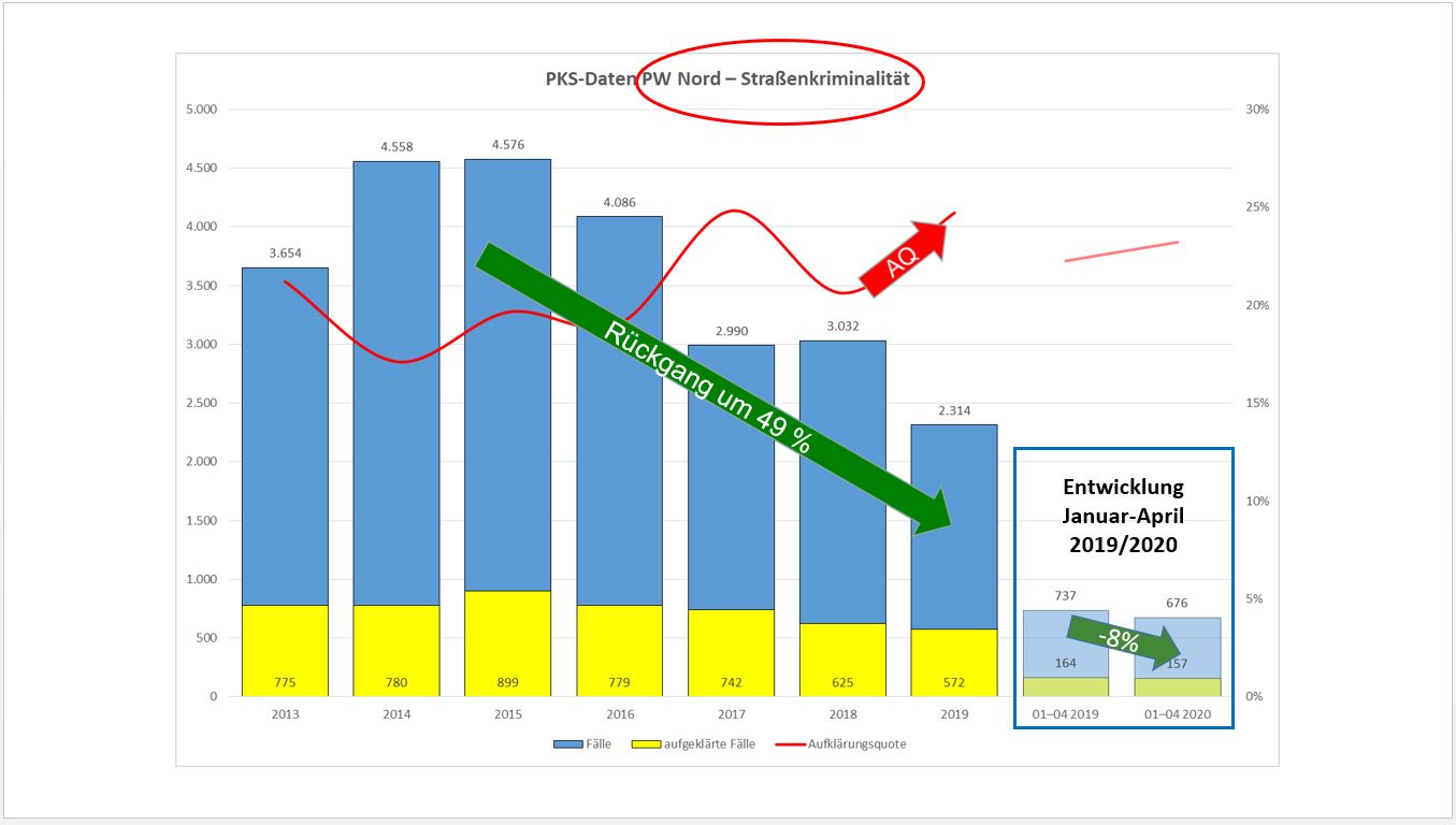 Als Grund hierfür nannte die Polizei die gemeinsamen Kraftanstrengungen vieler Beteiligter – unter anderem der Stadt und der Staatsanwaltschaft. Es gibt aber auch Handlungsfelder, in denen die Zahlen nach Rückgängen zurzeit stagnieren. Hier wären die Gewaltkriminalität, Raubdelikte und sonstige Raubüberfälle auf Straßen, Wegen und Plätzen zu nennen, wo es jeweils minimale Zunahmen gab.