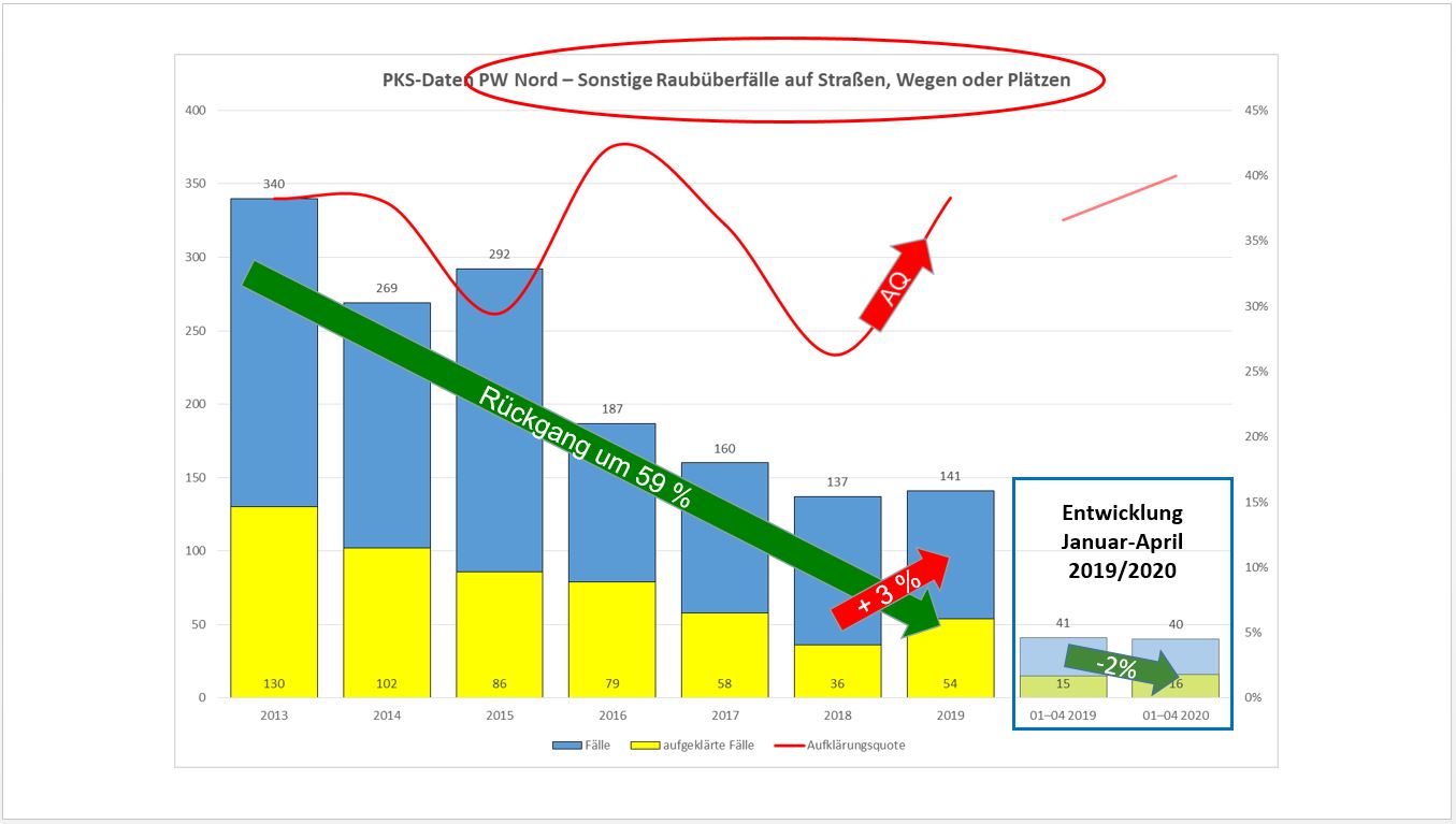 Nach stetigem Rückgang und einer Halbierung der Straßenraube seit 2013 stieg allerdings erstmals diese Zahl um 42 Fälle wieder an. Und zwar auf den nunmehr zweitniedrigsten Wert der letzten Jahre. Als Indikator dieser Zahlen gelten mehrere bekannt gewordene Fälle u.a. in Aplerbeck und im Bereich der Innenstadt sowie am Lüner Hauptbahnhof. Die Dortmunder Polizei reagierte darauf umgehend mit deutlich erhöhter Präsenz uniformierter und ziviler Polizeikräfte an den betroffenen Orten. Dies führte zu einer Vielzahl an Festnahmen. Durch die enge Zusammenarbeit von Polizei und Staatsanwaltschaft im Haus des Jugendrechts kam es hier bereits zu empfindlichen Haftstrafen für ermittelte Straftäter. Ein erster Blick auf die aktuelle Entwicklung im Juni und Juli zeigt, dass die Anzahl der angezeigten Straßenraube deutlich zurückgeht. Trotzdem wird die Polizei die Entwicklung in diesem Bereich mit Argusaugen beobachten, um bei Bedarf wieder schnell und erfolgreich reagieren zu können.