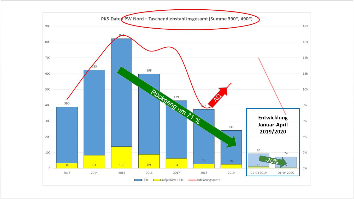 Für die Straßenkriminalität ist der Rückgang noch deutlicher: Von 4.086 Fällen in 2016 und 3.032 in 2018, lag der Wert im Dezember 2019 bei 2.314 – das entspricht einem Rückgang seit 2016 um 43 Prozent. Beim Taschendiebstahl waren es im Jahr 2016 598 Taten, in 2018 noch 374 und in 2019 noch 241 Taten – ein beachtlicher Rückgang seit 2016 um rund 60 Prozent.
