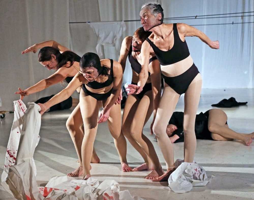 Dazu passt die quer über die Bühne gespannte Wäscheleine, an der eine Tänzerin (Monika Heitmeier) fröhlich pfeifend frischgewaschene Weißwäsche aufhängt – die trotzdem blutige Spuren aufweist. Flecken, die offenbar nicht wegzuwaschen sind und die bald auch die Tänzerinnen an sich tragen, denen das Kunststück gelingt, in die an der Leine hängenden Oberteile hineinzuspringen. Irgendwann liegt all die Kleidung auf einem großen Haufen am Boden – günstig erworbener und dennoch teuer erkaufter Wohlstandsmüll.