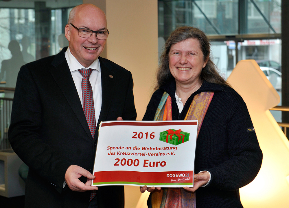 Am Dienstag, dem 13. Dezember 2016, übergab DOGEWO21-Geschäftsführer Klaus Graniki im Kundenzentrum an der Landgrafenstraße eine Geldspende in Höhe von 2.000 Euro an Petra Bank vom Kreuzviertel-Verein und dankte dem Kreuzviertel-Verein für die gute Zusammenarbeit auch im Jahr 2016.