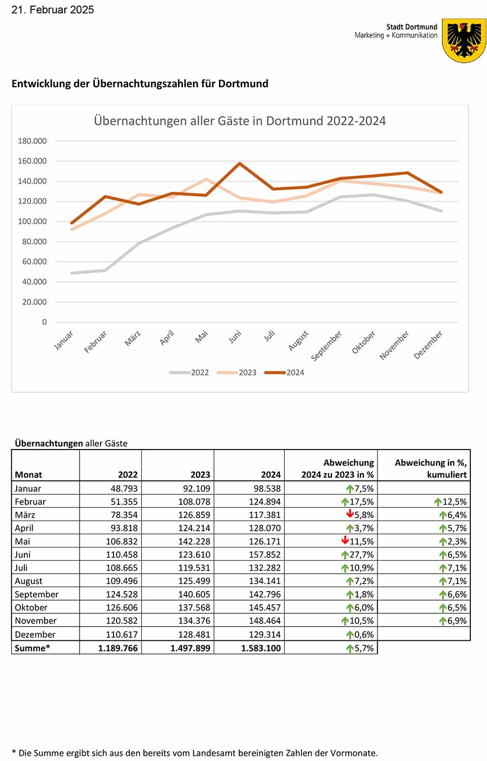 Die Zuwächse sind vor allem ausländischen Gäste zu verdanken, die nach Dortmund kamen, um für einen Aufenthalt zu bleiben. Bei den Gästen aus dem Ausland verdoppelte sich die Zahl der Übernachtungen von Mai bis Juni in Dortmund auf 61.987.