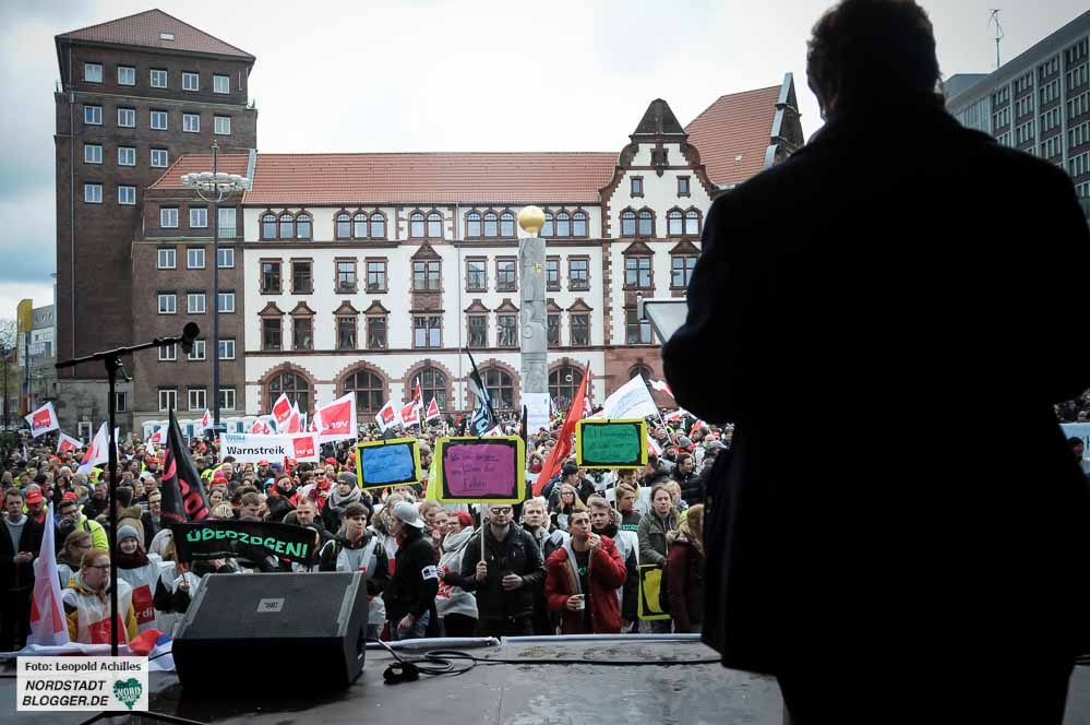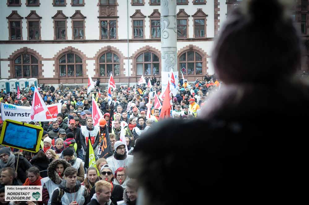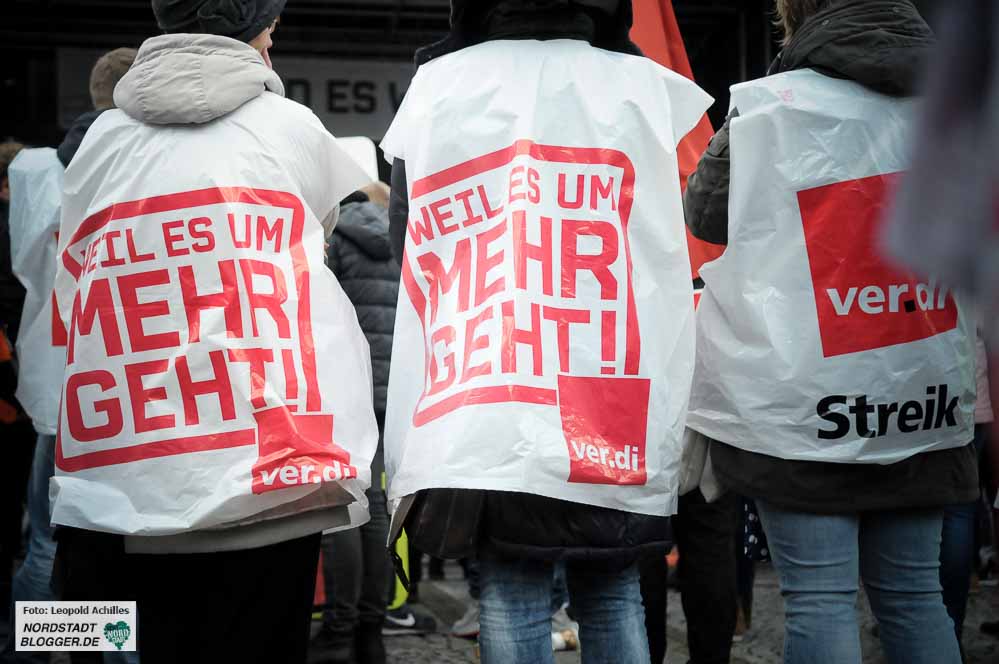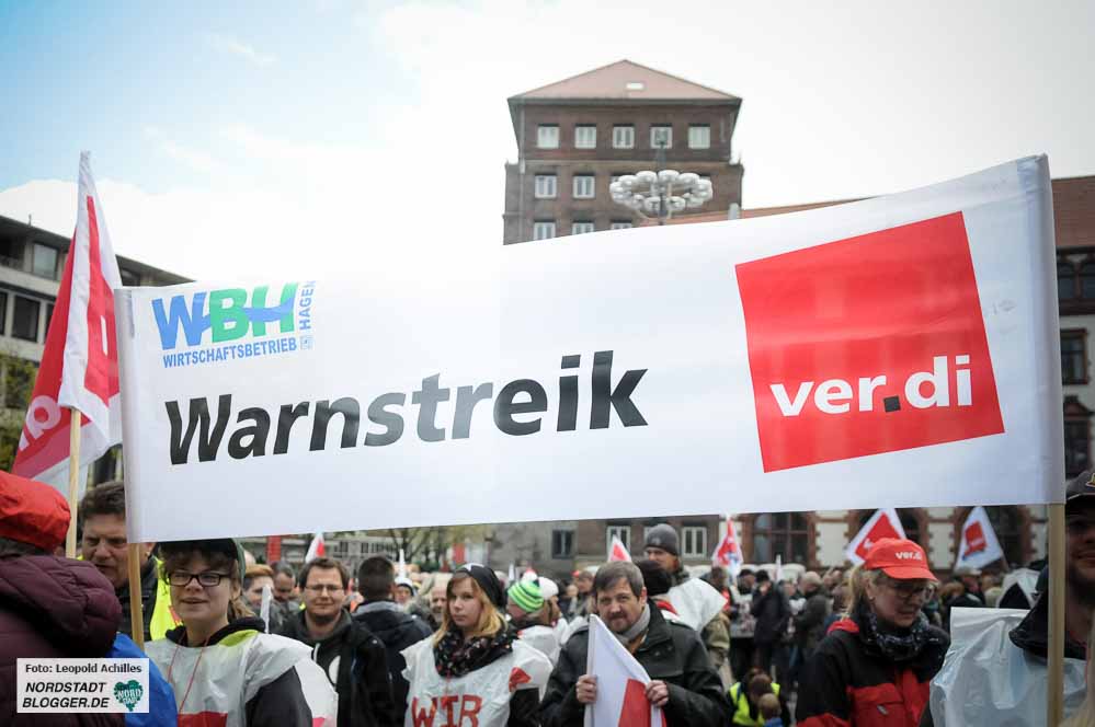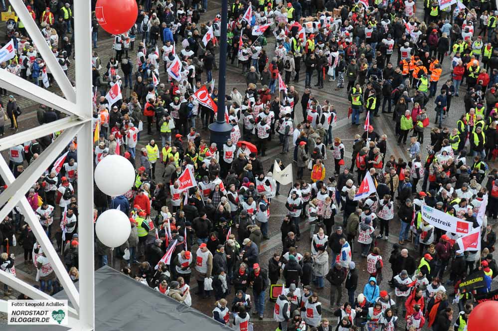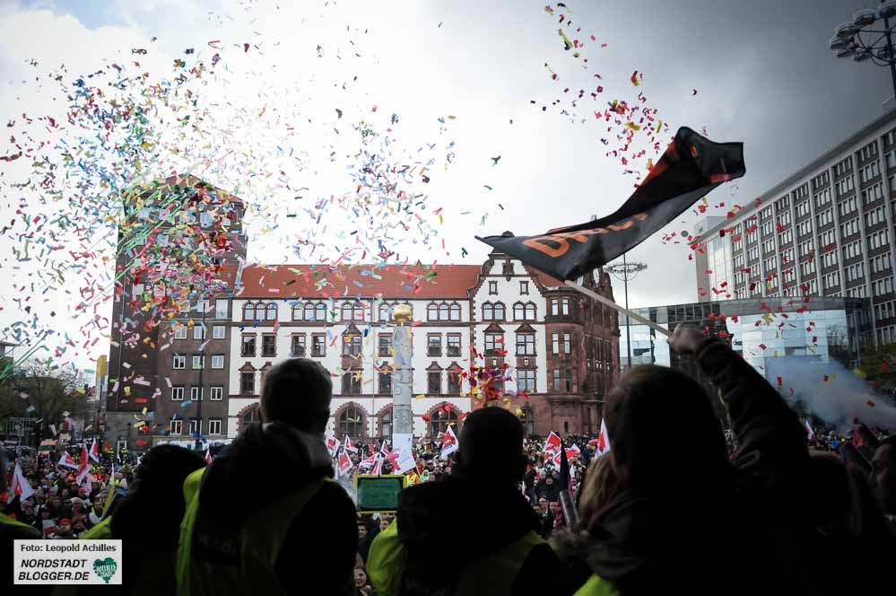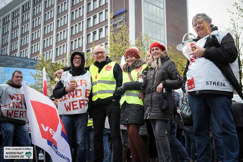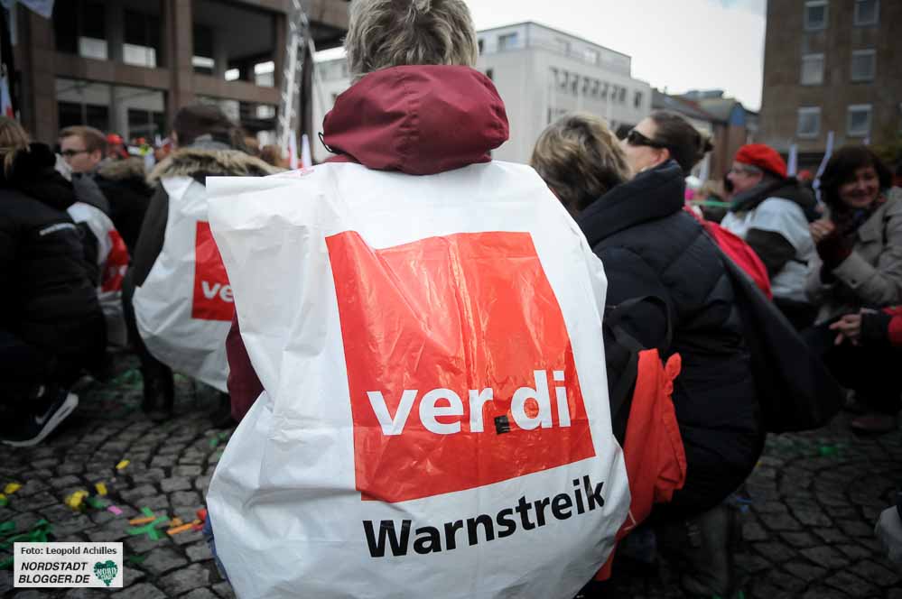 Obwohl das Wetter alles andere als streikfreundlich war, beteiligten sich dennoch insgesamt rund 8000 Verdi-Mitglieder am Warnstreik. Sternförmig waren die TeilnehmerInnen mit Fahnen und „Wir sind es wert“-Westen aus vielen Städten der Umgebung von sechs Sammelpunkten aus zum Friedensplatz zur Abschlusskundgebung gezogen.