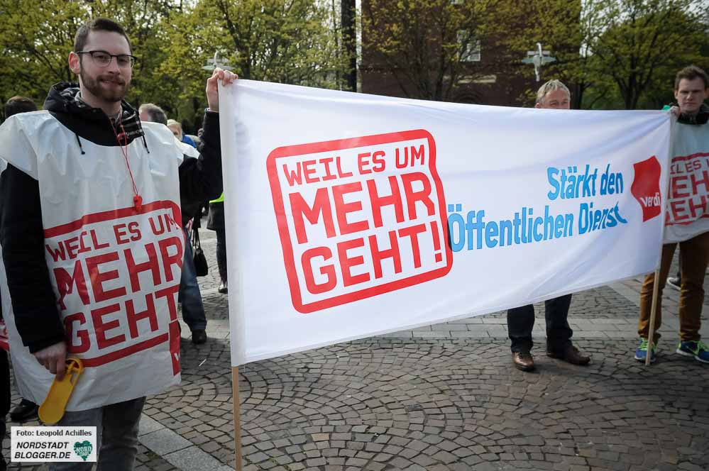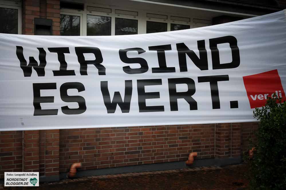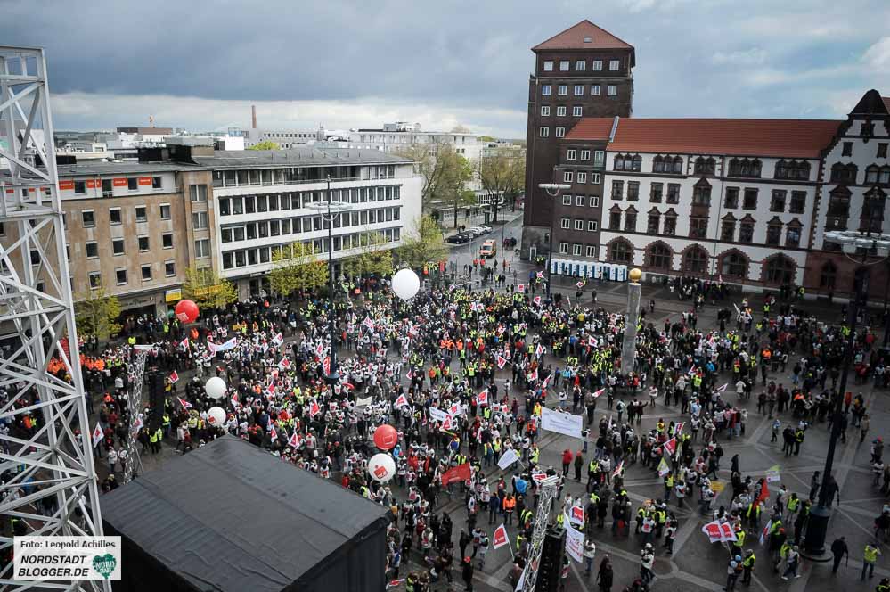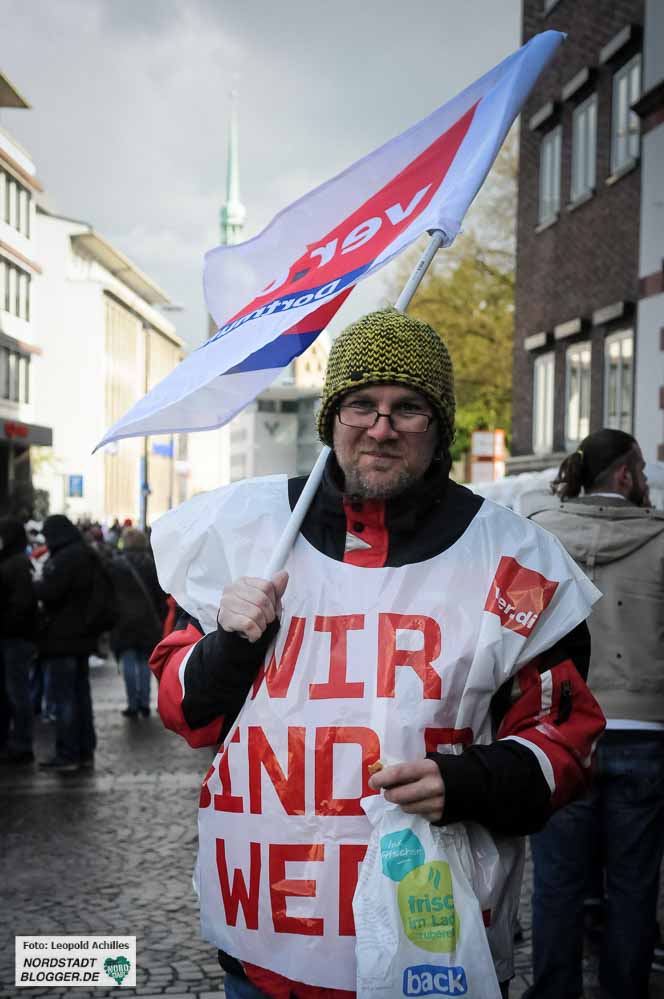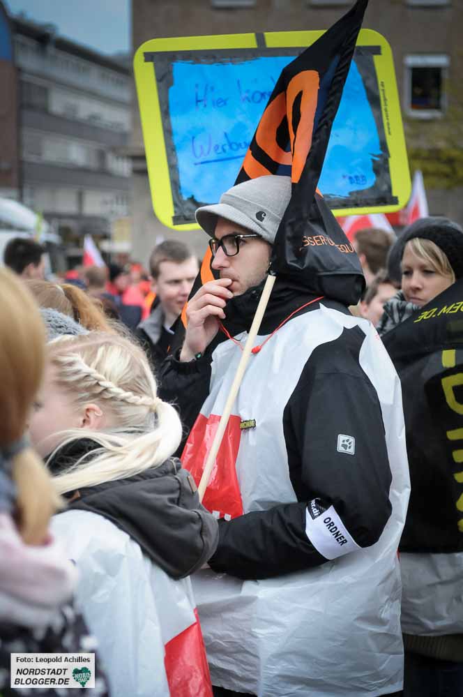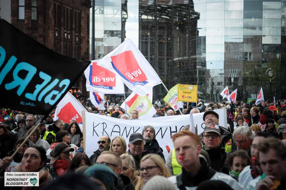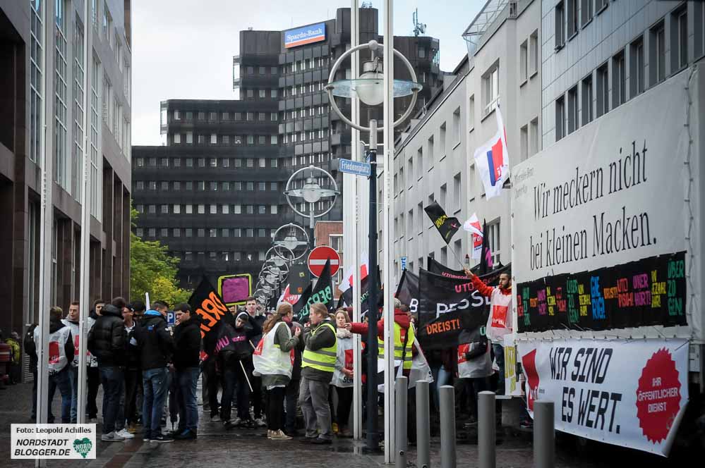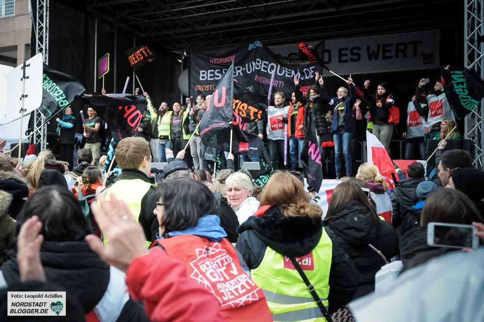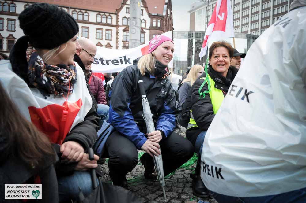 Obwohl das Wetter alles andere als streikfreundlich war, beteiligten sich dennoch insgesamt rund 8000 Verdi-Mitglieder am Warnstreik. Sternförmig waren die TeilnehmerInnen mit Fahnen und „Wir sind es wert“-Westen aus vielen Städten der Umgebung von sechs Sammelpunkten aus zum Friedensplatz zur Abschlusskundgebung gezogen.